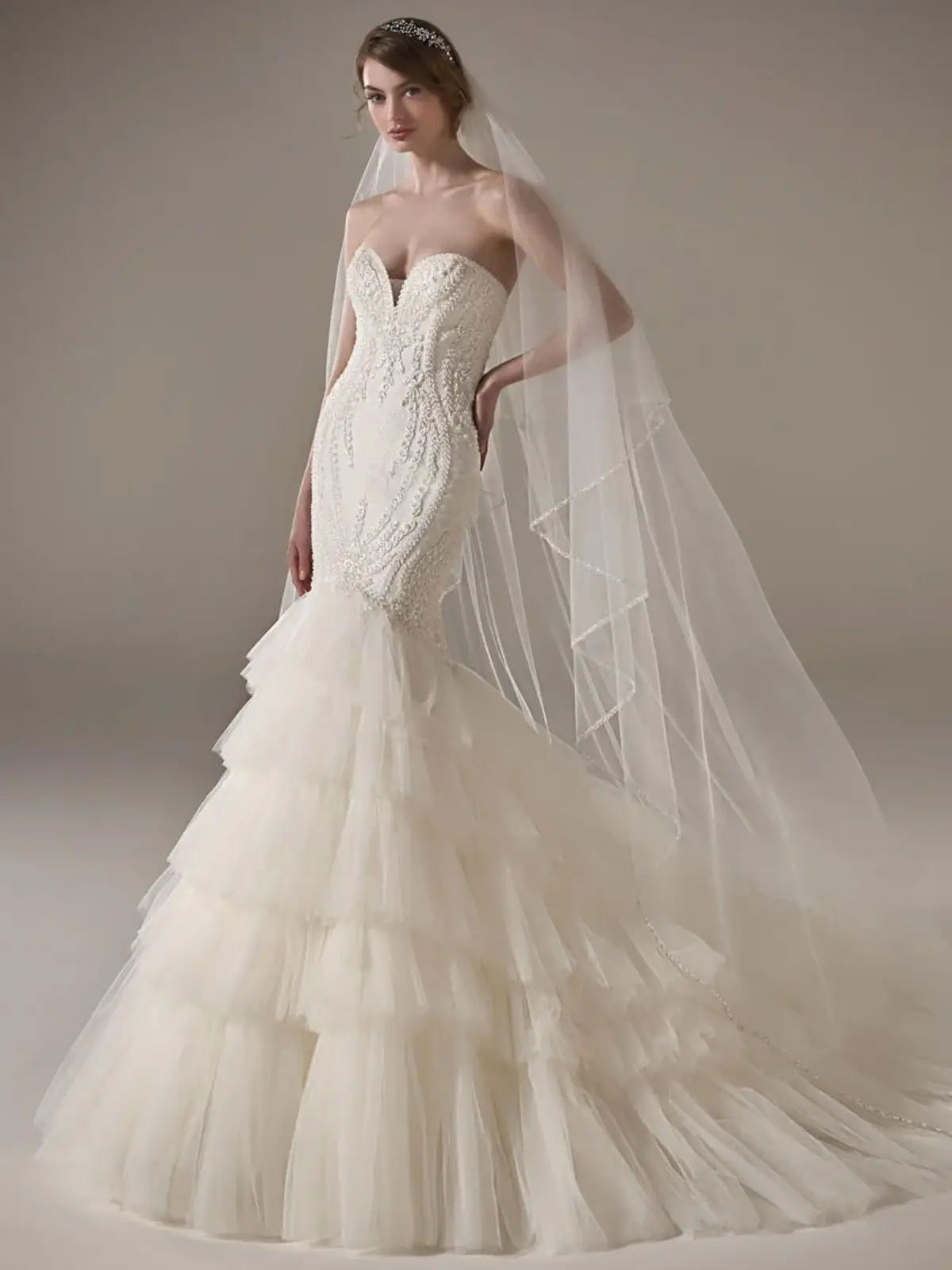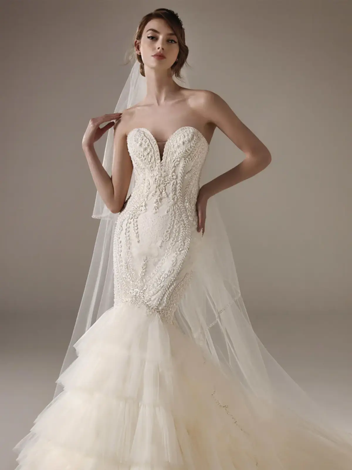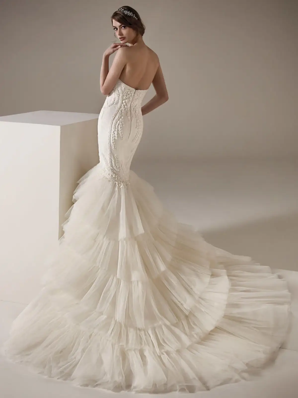 Vestido corte sirena deslumbrante en tul suave rematado con bordados brillantes en tonos marfil en sincronía con la silueta para resaltarla. Cuenta con un corpiño a la moda y un profundo escote corazón sostenido por un corsé y unas copas interiores. La espalda es descubierta con talle a la cintura. Tiene una falda con volantes y confeccionada en magnífico tul. Desde las rodillas hacia arriba, el tul bordado crea una silueta sensual que presenta un corpiño que marca la silueta de forma ideal. Es un vestido muy cómodo y no pesa.