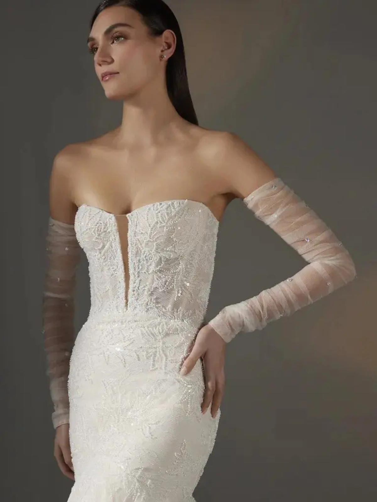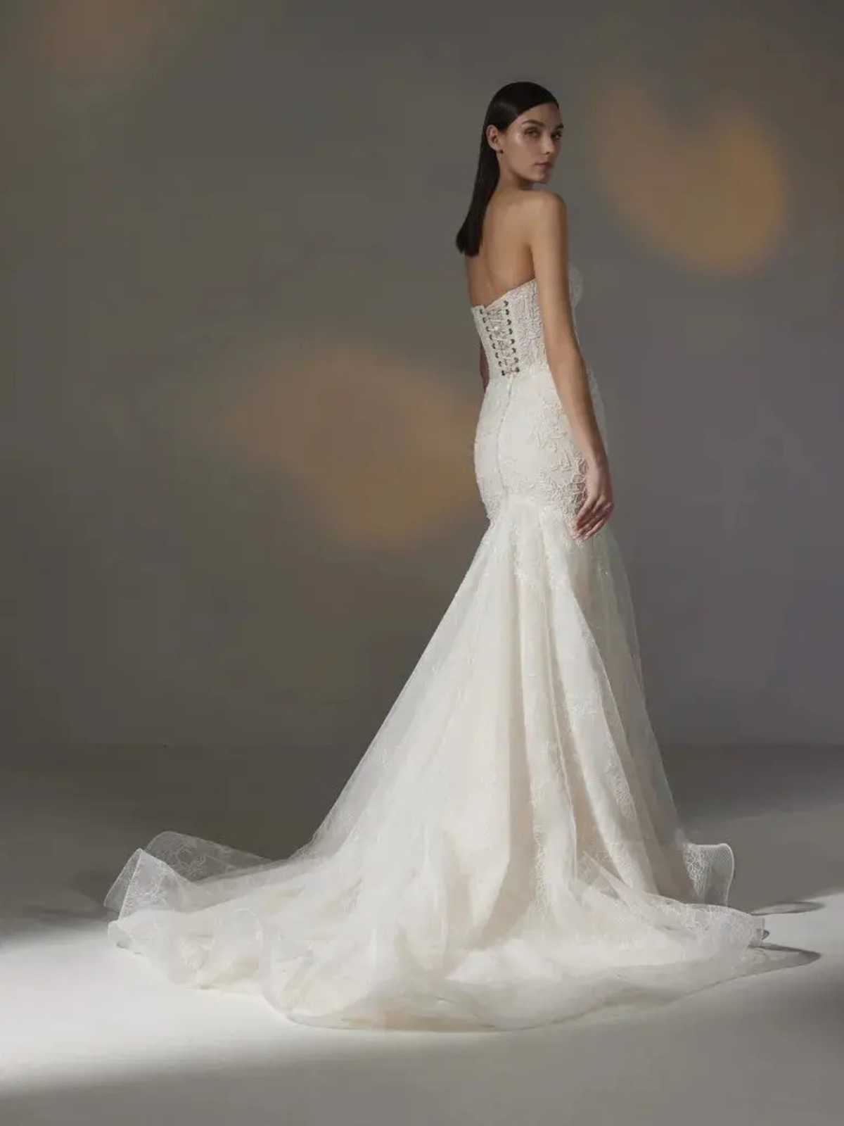 Luce este vestido sirena de talle bajo con cola catedral. Confeccionado en encaje con detalles bordados, presenta un corpiño sin mangas y un escote corazón. La espalda luce un sensual diseño palabra de honor con un cierre de cordones tipo corsé.