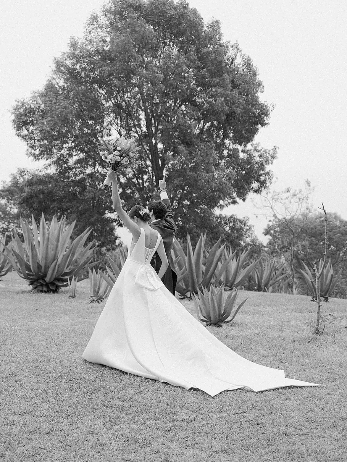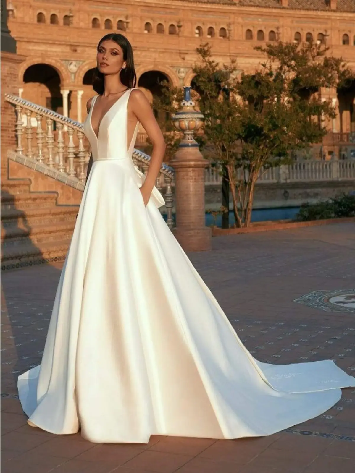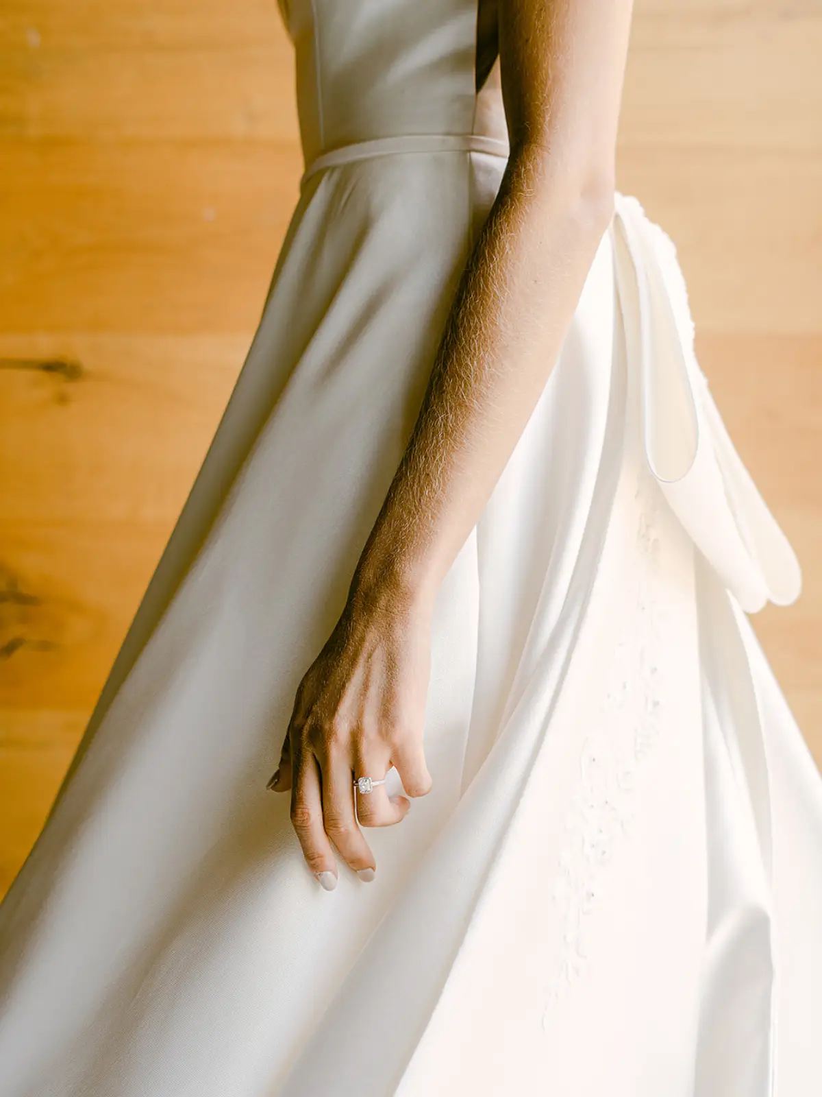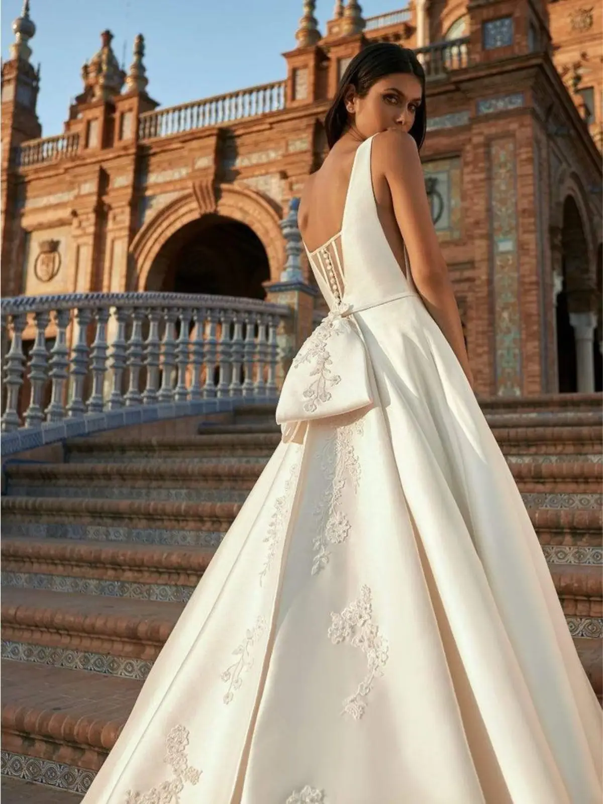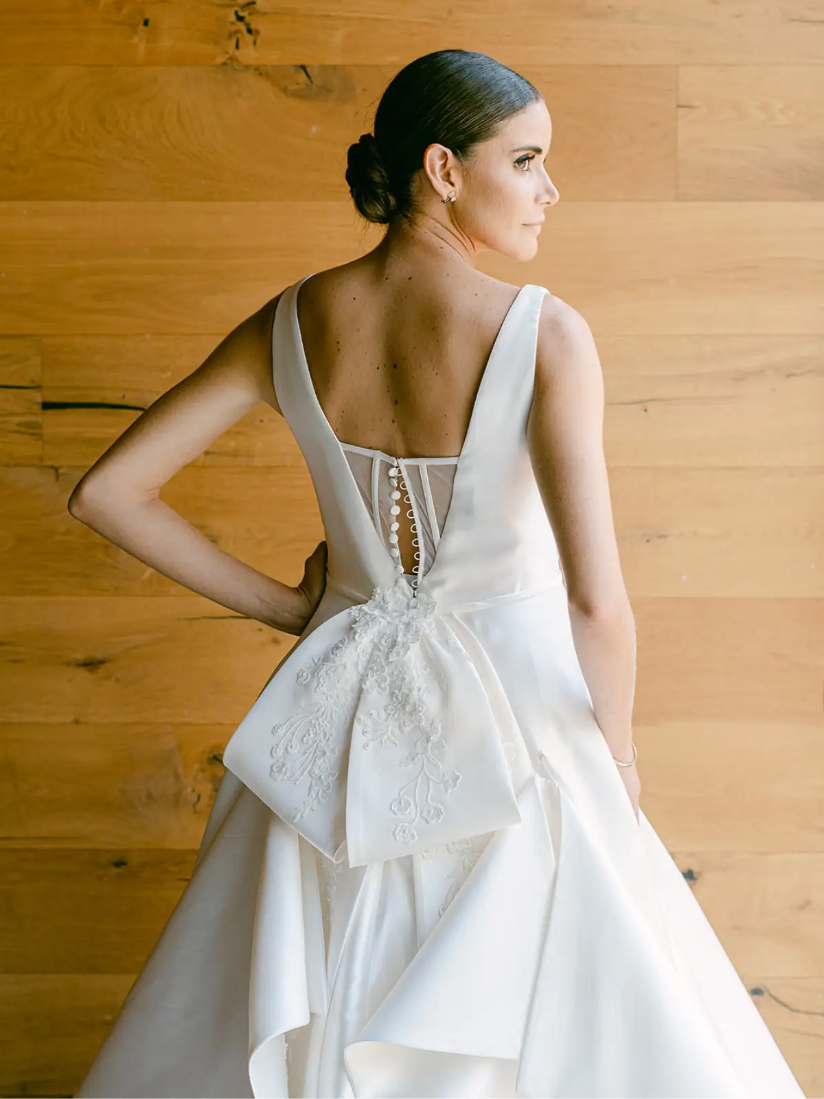 Modelo: Fernanda / Marchesa for Pronovias. Un vestido de princesa que roba escenas en mikado brillante con bordados sutiles. Una espectacular espalda creada con un panel corsé y un lazo estilo francés que oculta la cremallera y cae con gracia hasta el suelo. Escote bajo y cortes laterales forrados con red nude.