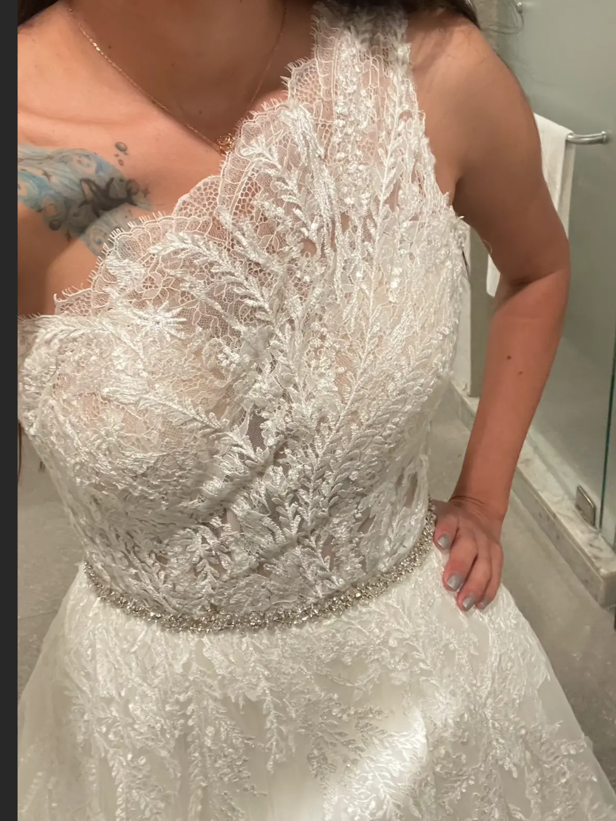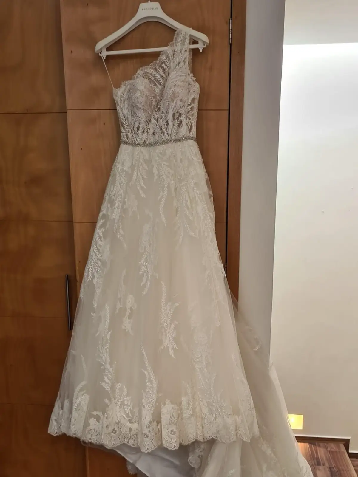 Hermoso vestido Pronovias, las fotos no le hacen justicia, cargado de la mejor vibra, se le agregó el cinturón de cristales que se observa mejor en la última foto. Se le modificó únicamente de tomarle 1cm en el hombro. Tiene cauda bellísima