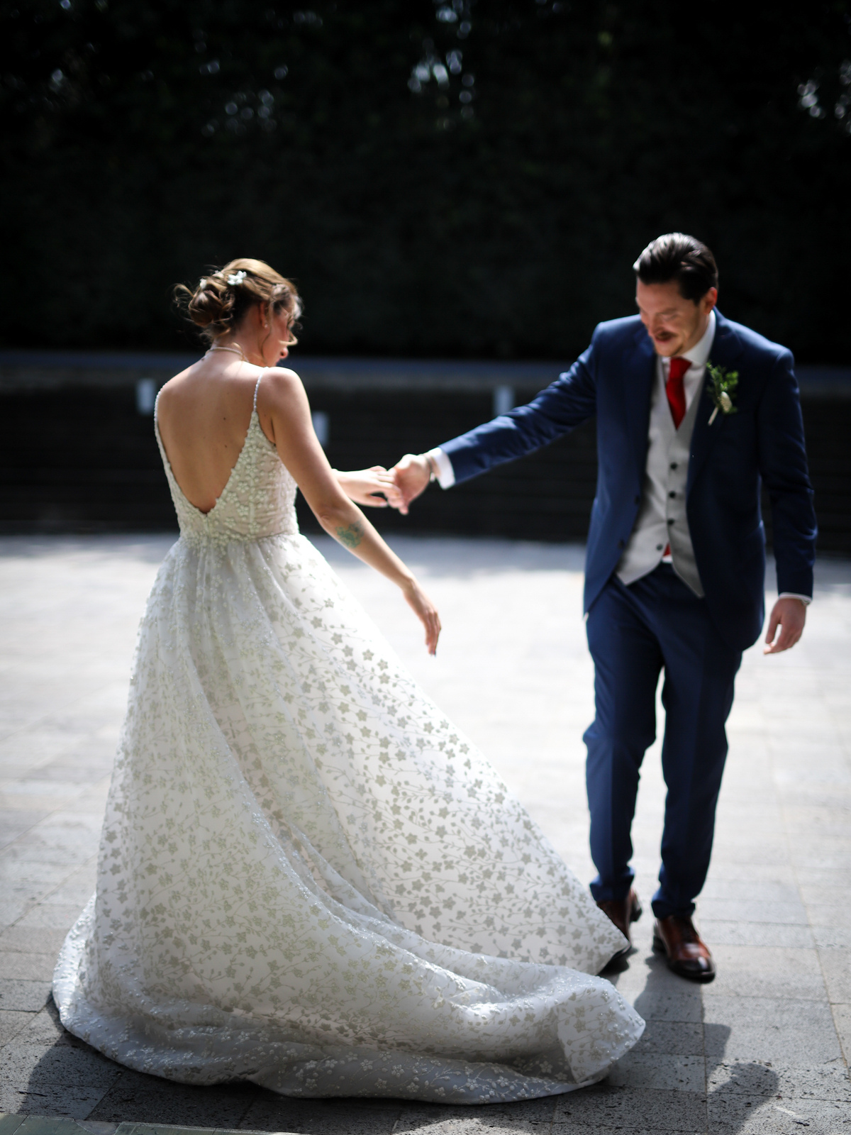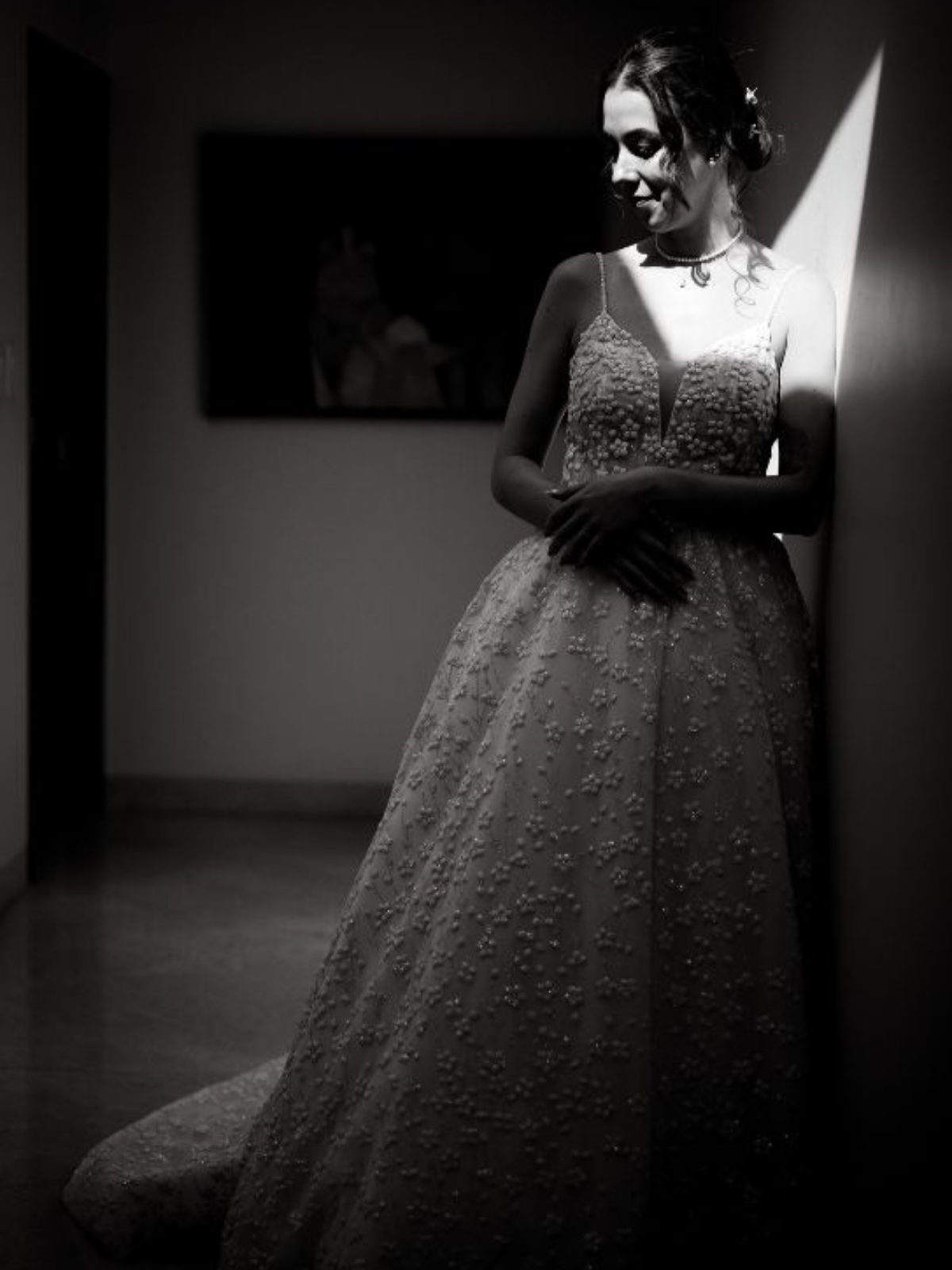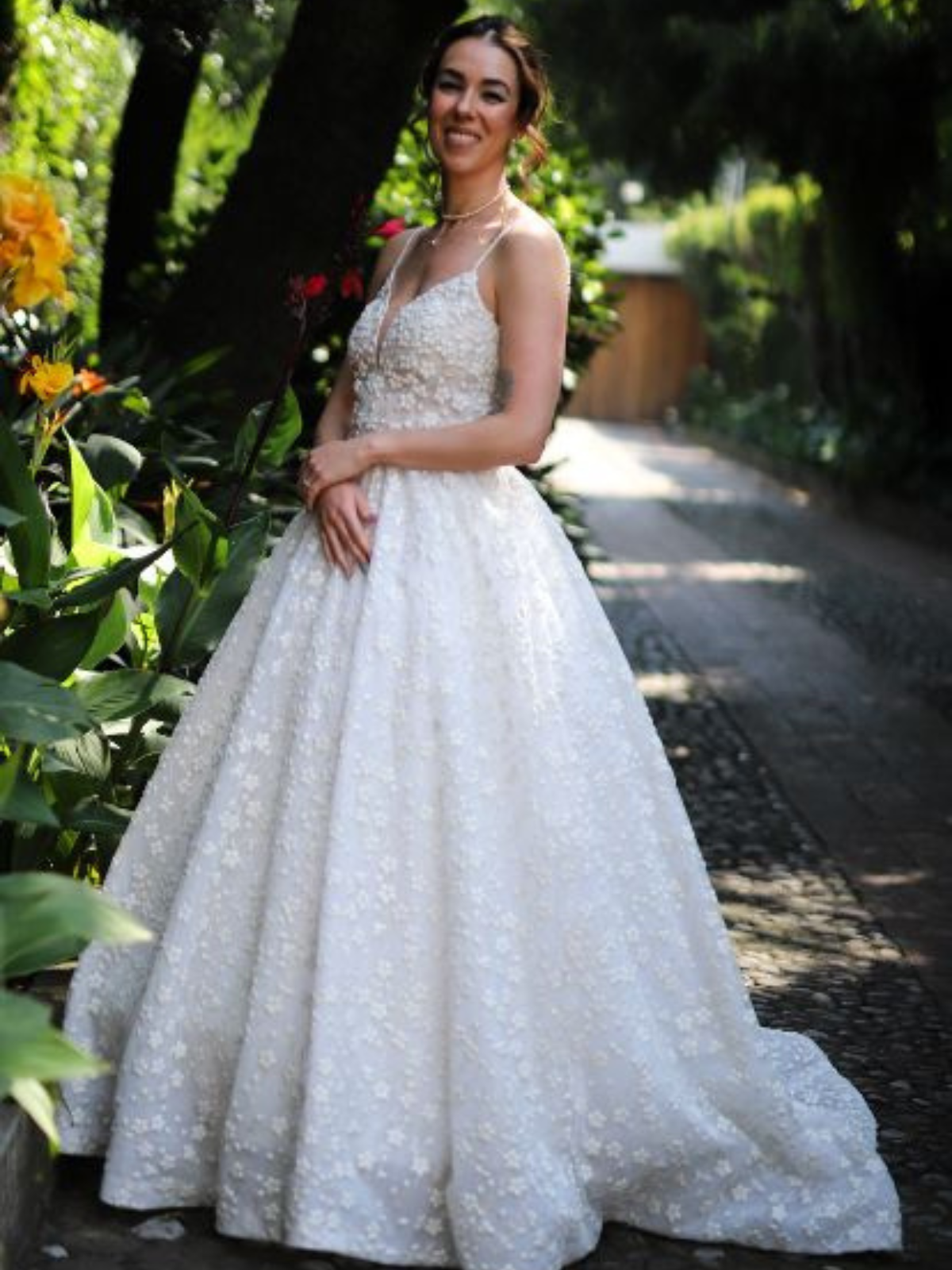 La silueta es ajustada en la parte superior y cae suavemente a partir de la cintura en una falda amplia y fluida, creando movimiento y un efecto vaporoso al caminar. El fondo del vestido es en tono marfil o nude suave, lo que realza el contraste y la textura del bordado blanco.