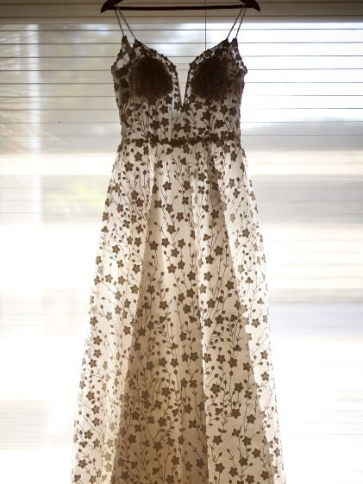Vestido largo de estilo etéreo y romántico, confeccionado en una tela ligera y semitransparente con bordado floral en relieve distribuido de forma uniforme en todo el cuerpo. Presenta un escote en V profundo al frente que estiliza el torso, sostenido por tirantes delgados, aportando delicadeza y feminidad.