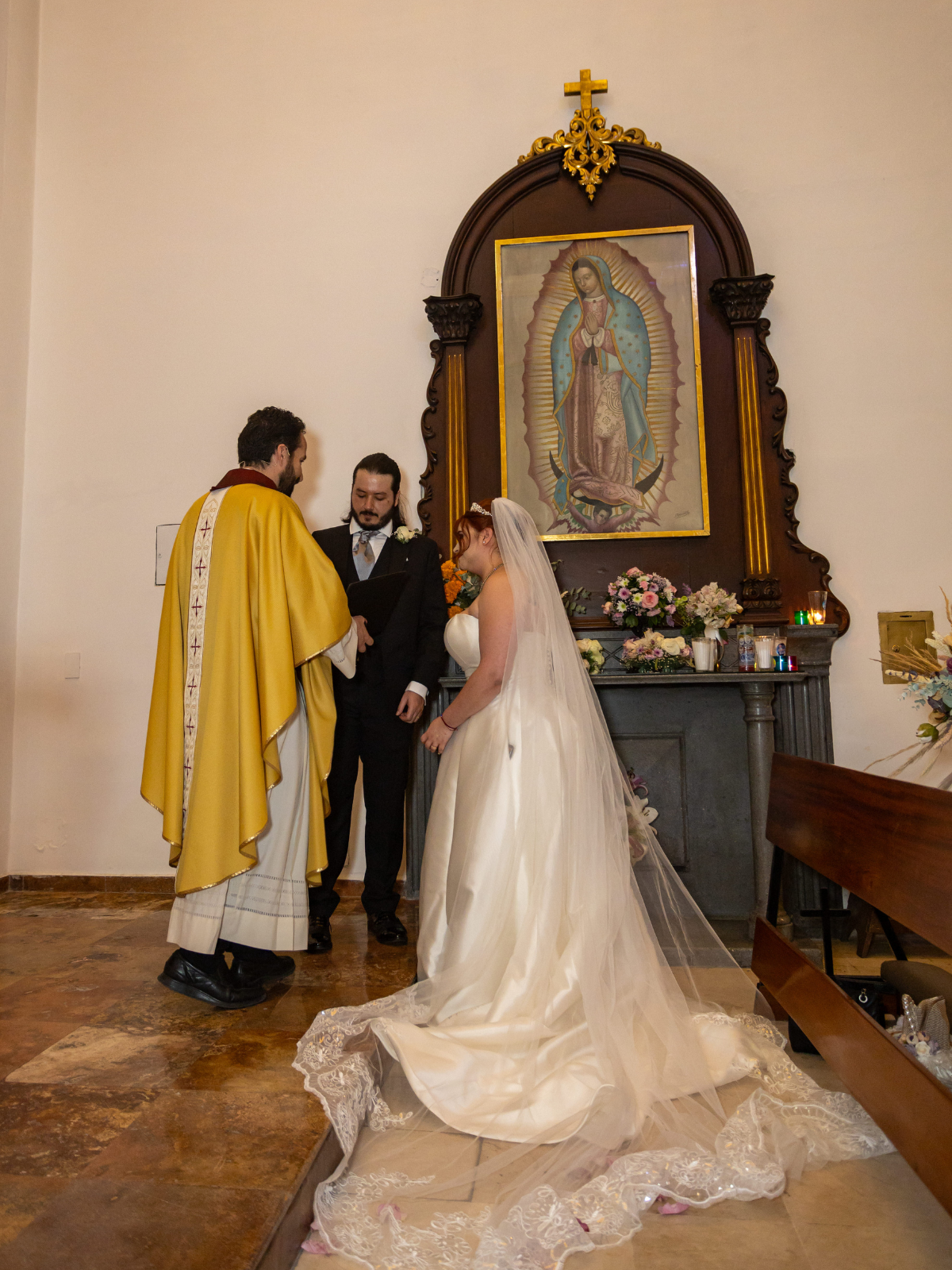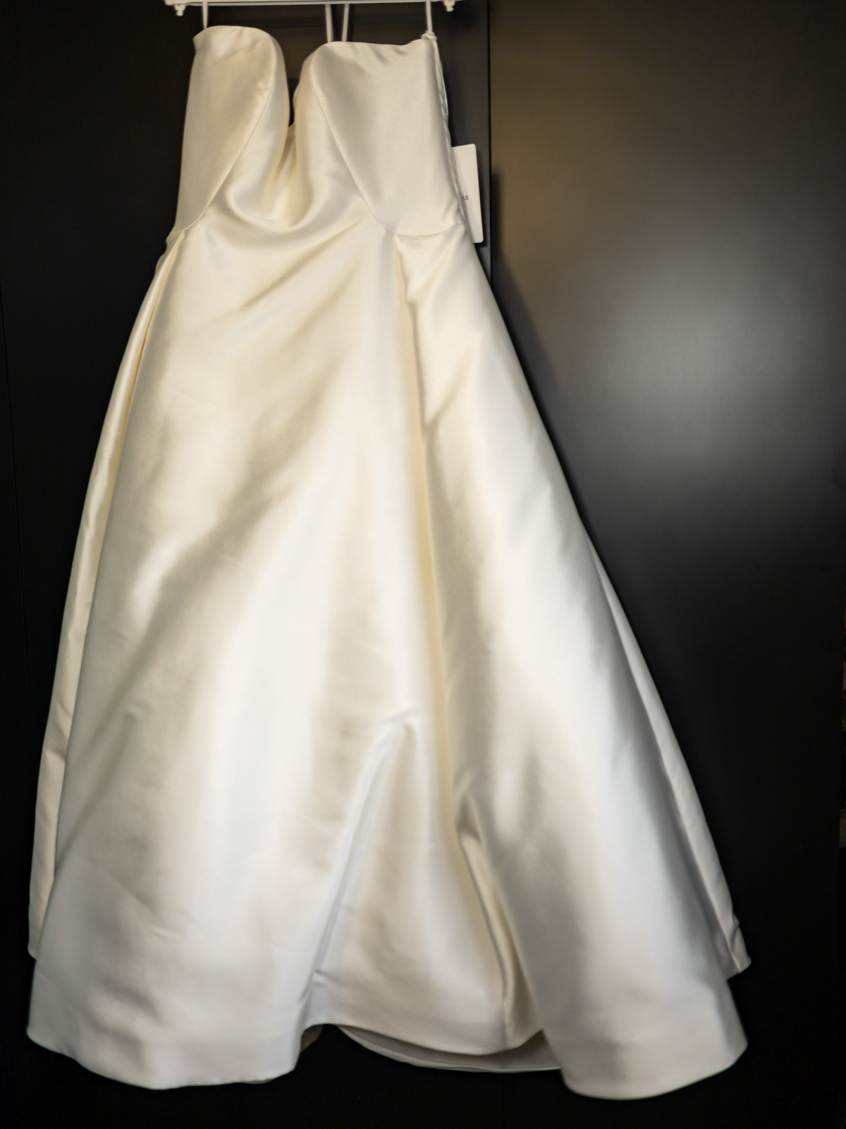 Es un vestido strapless con una faja interior comodidad, con bolsas a lo lados y una cola preciosa.