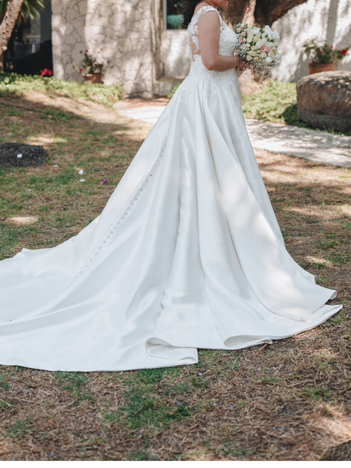 Vestido marca pronovias, Corte Strapple corazón cubierto con encaje. Tela mixta. Mikado y encaje.