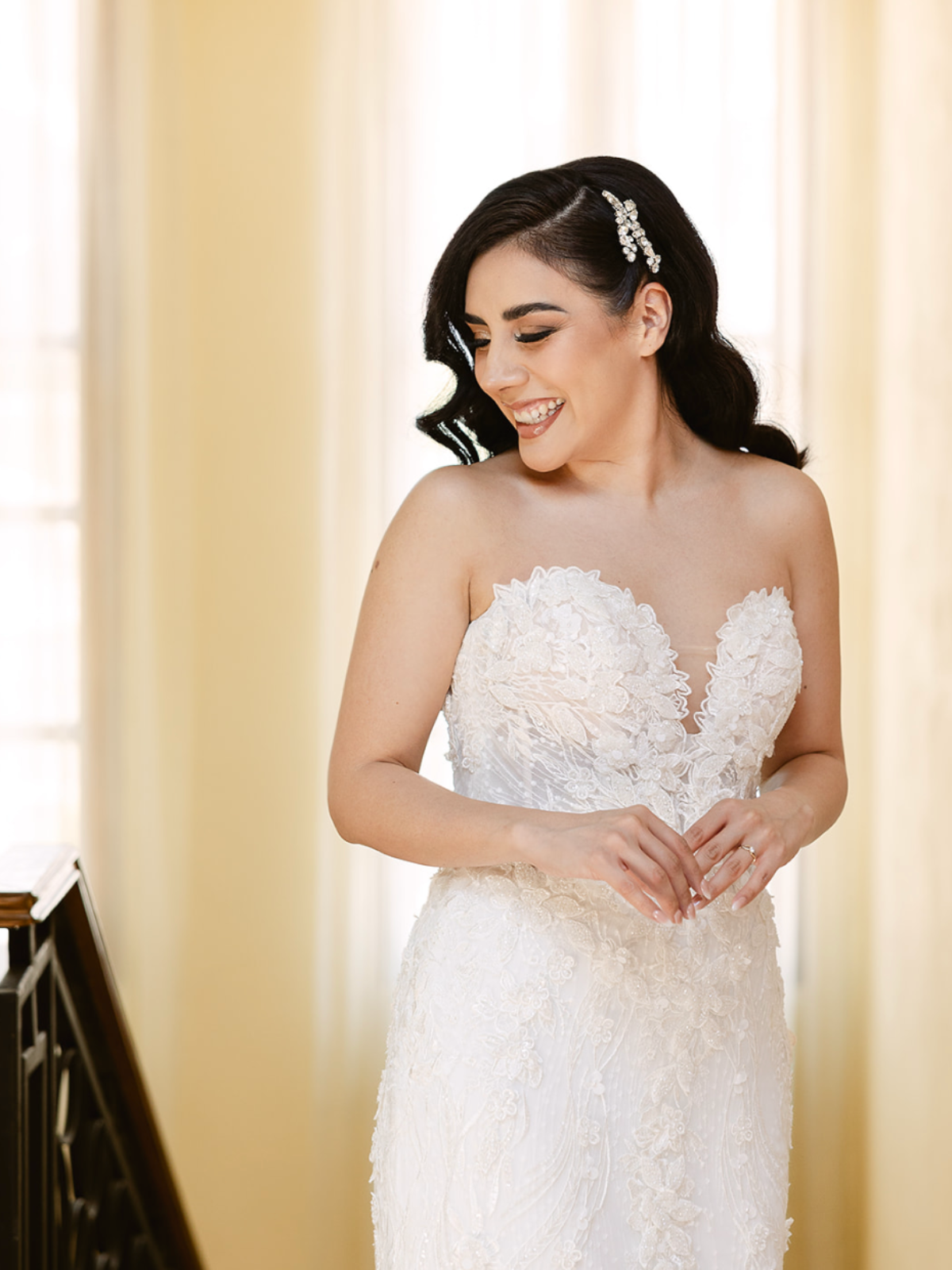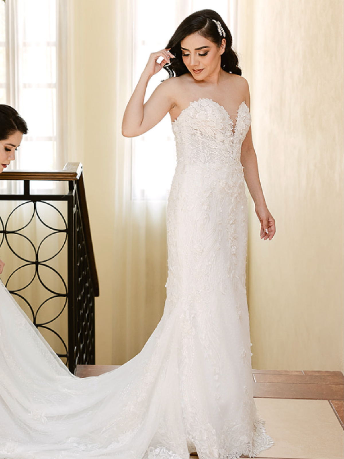 Vestido de novia con corte sirena, escote corazón y espalda descubierta. Incluye velo de tul con encaje.