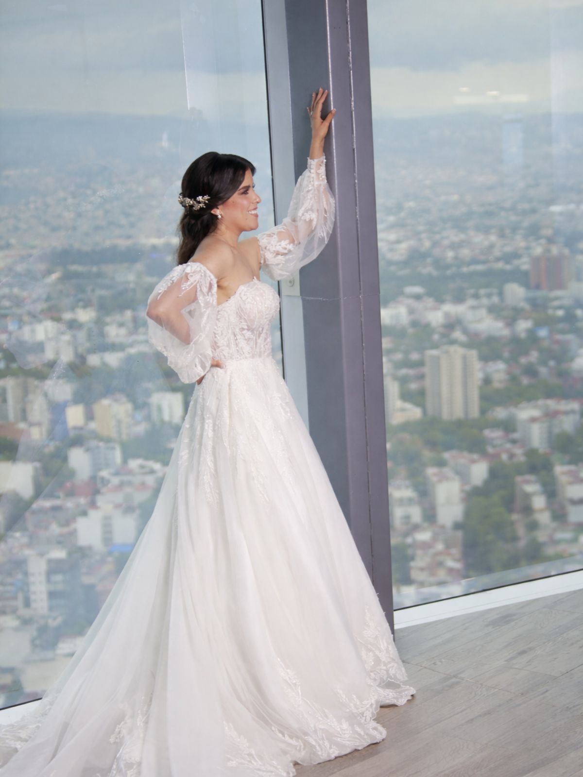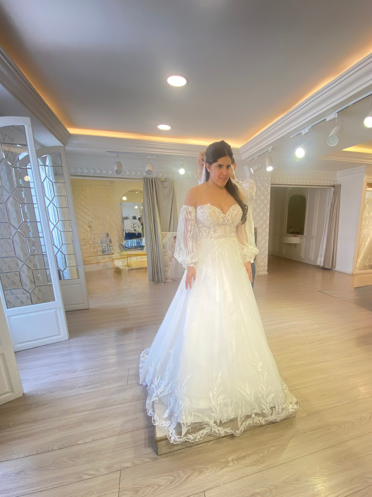 Vestido estilo princesa con aplicaciones de pedrería y bordado, escote corazón, adicional cuenta con mangas de tul transparente con bordado, cuerpo corsé con encaje y pedrería.