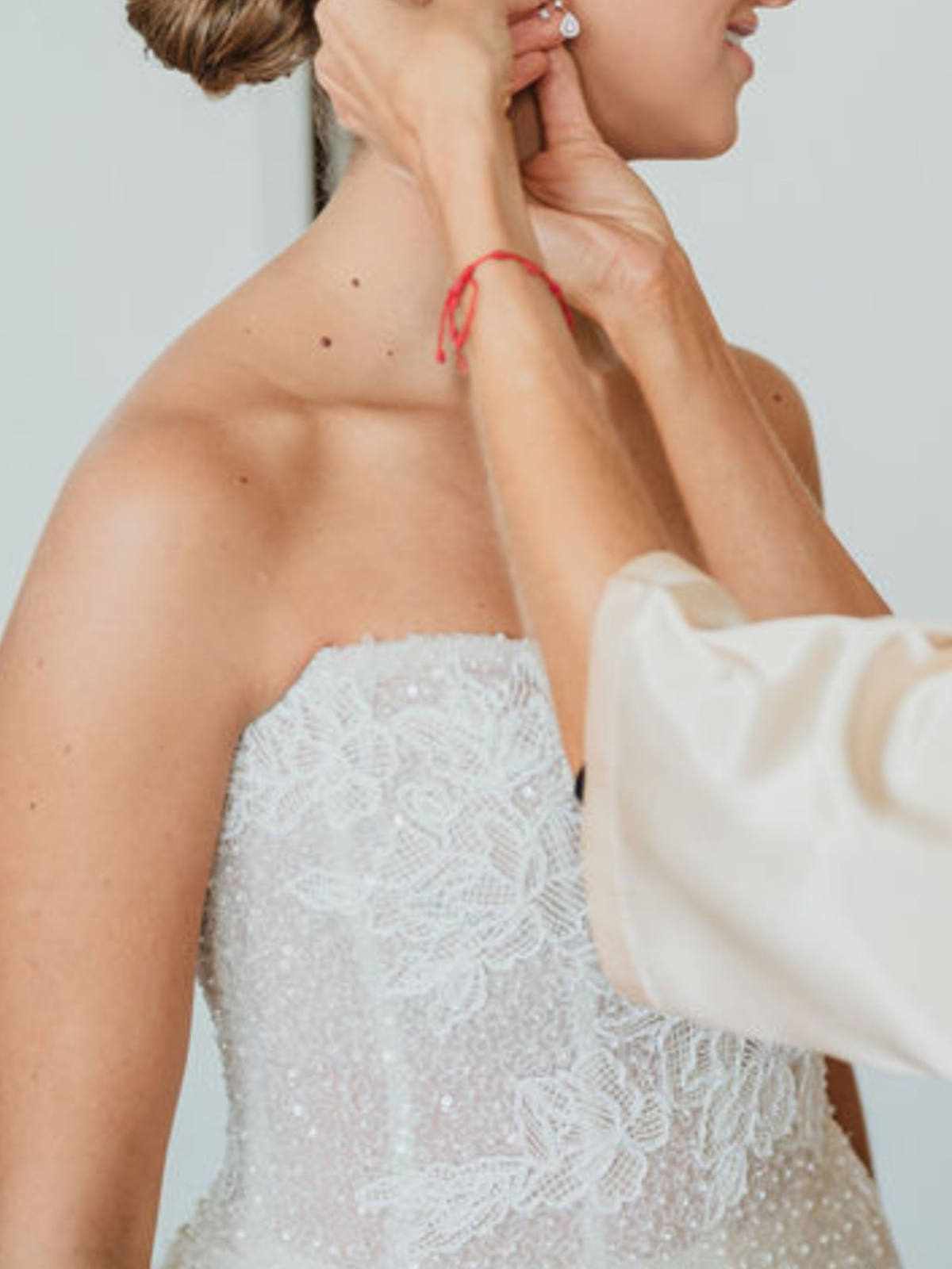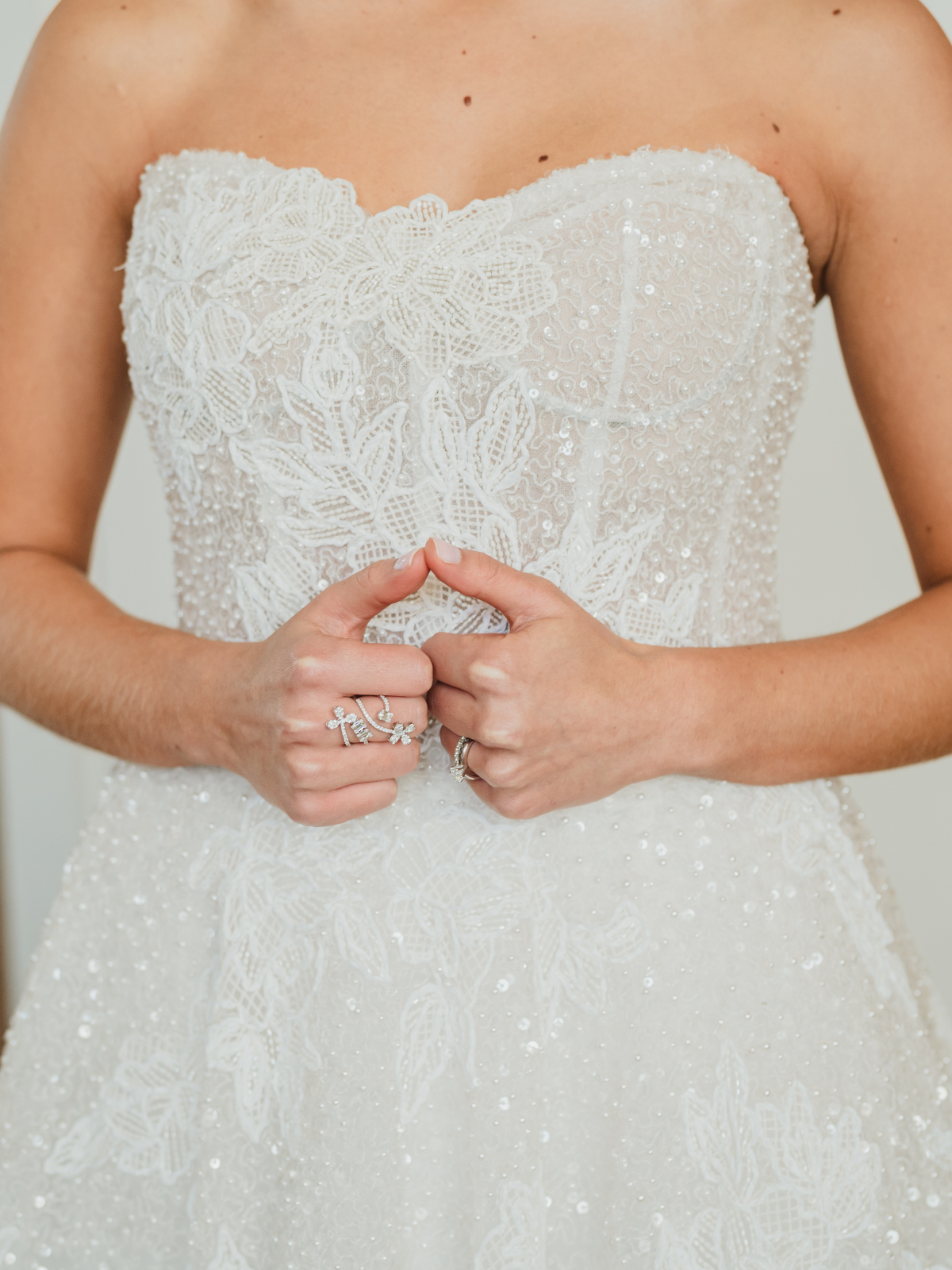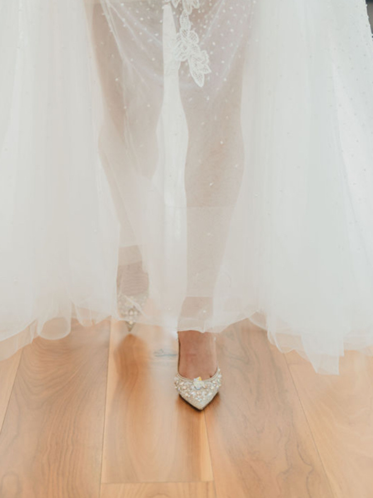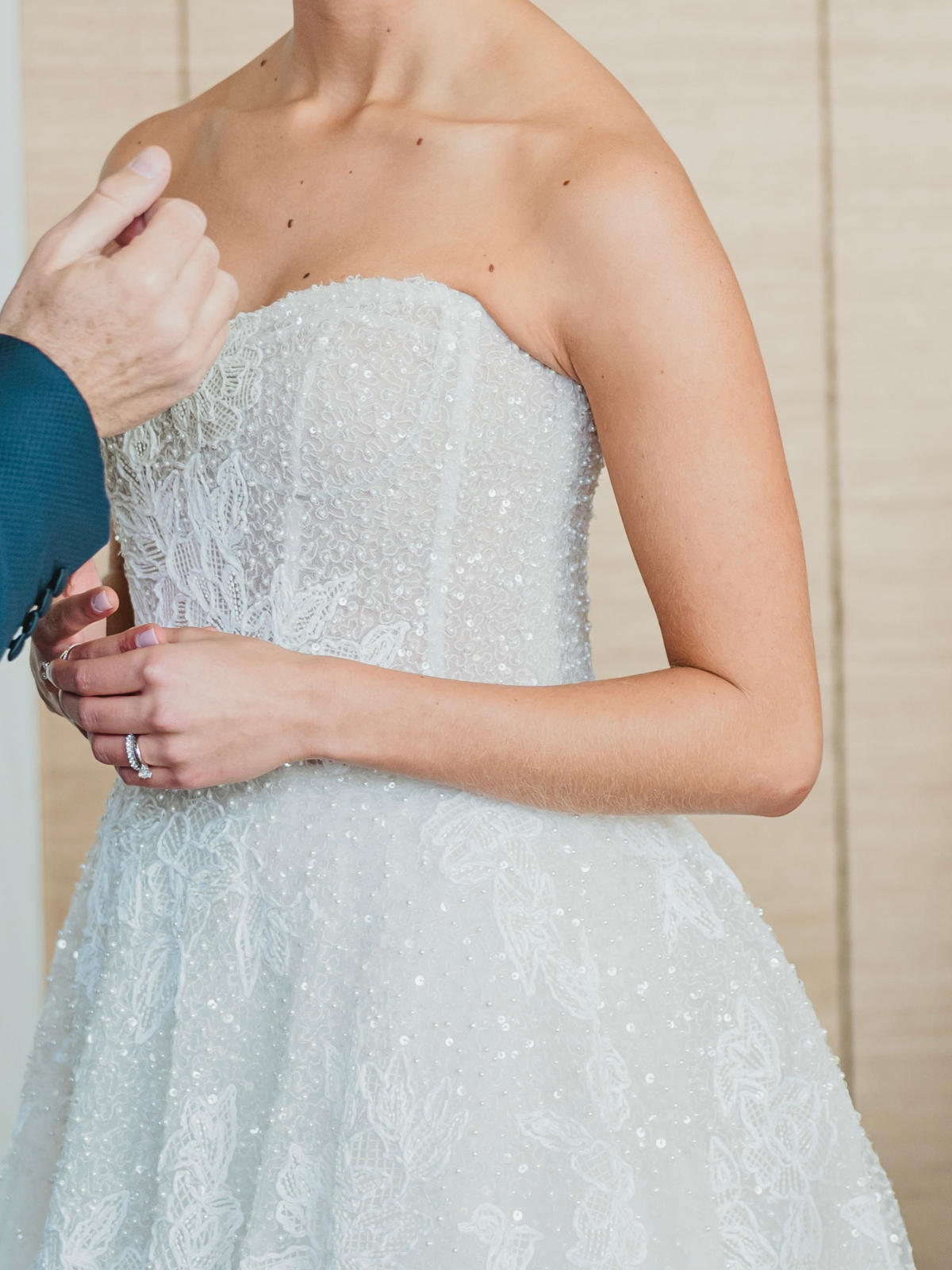 Vestido de novia strapless con bordado perlas y tul. Ligero, cómodo, transparencia, elegante, jovial.