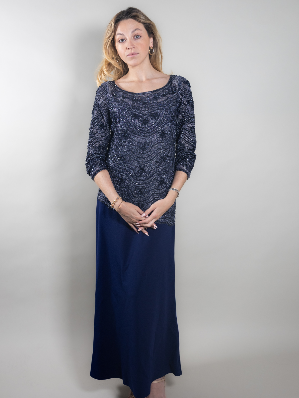 Vestido Rosa Clara, color azul marino, bordado con piedras, manga tres cuartos