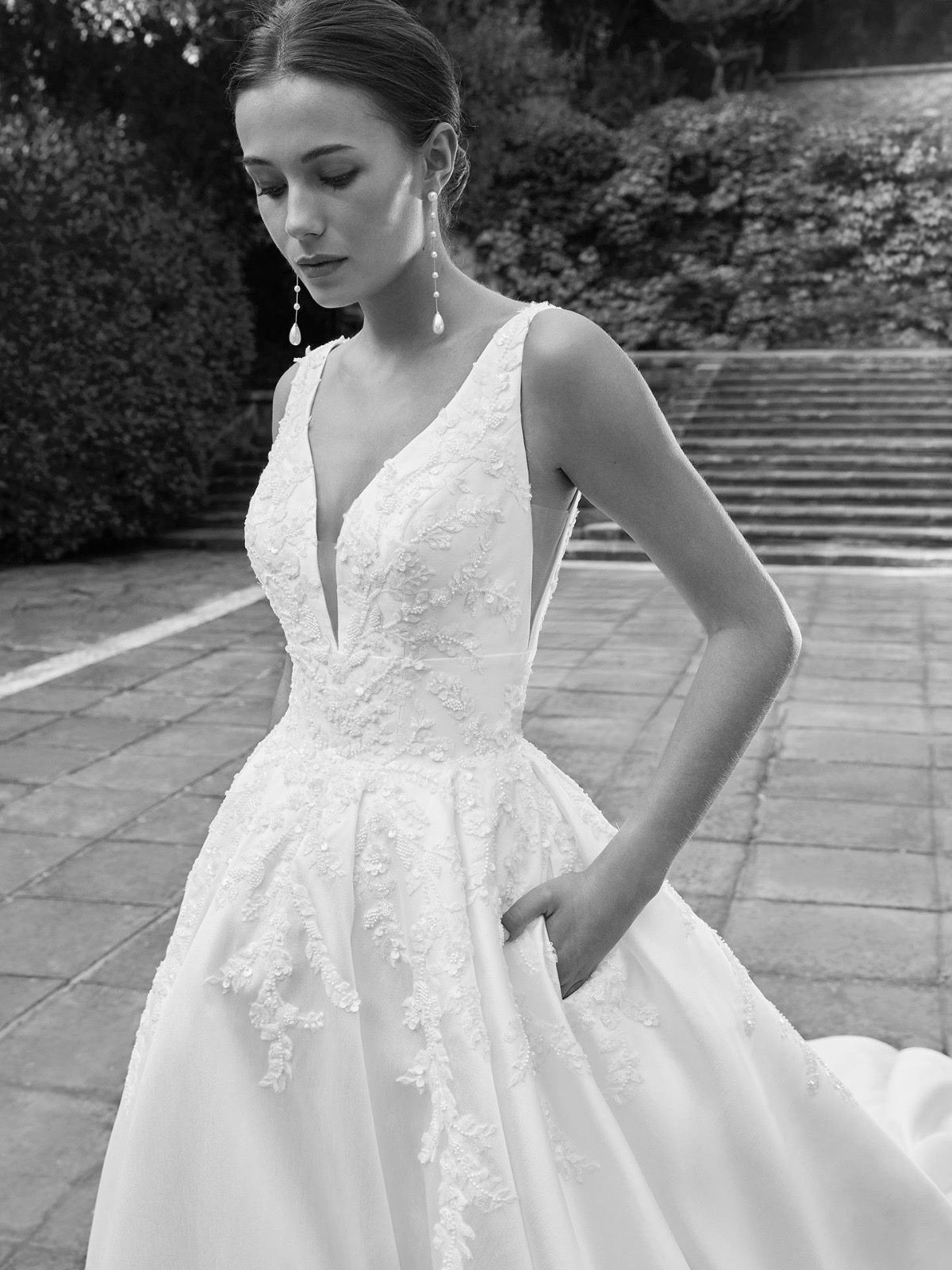 Vestido Rosa Clara en corte princesa. Bordado en la parte superior con escote en V en la espalda. Cola larga con opción a recogerse.