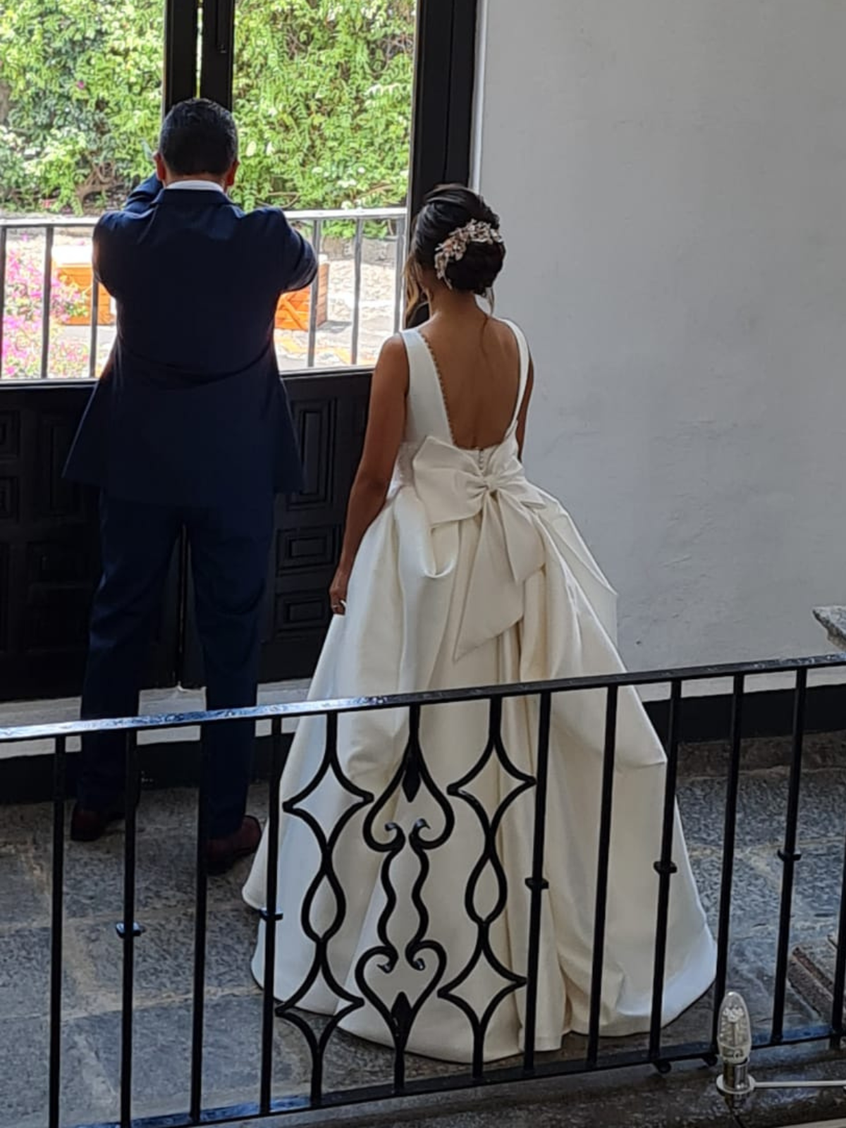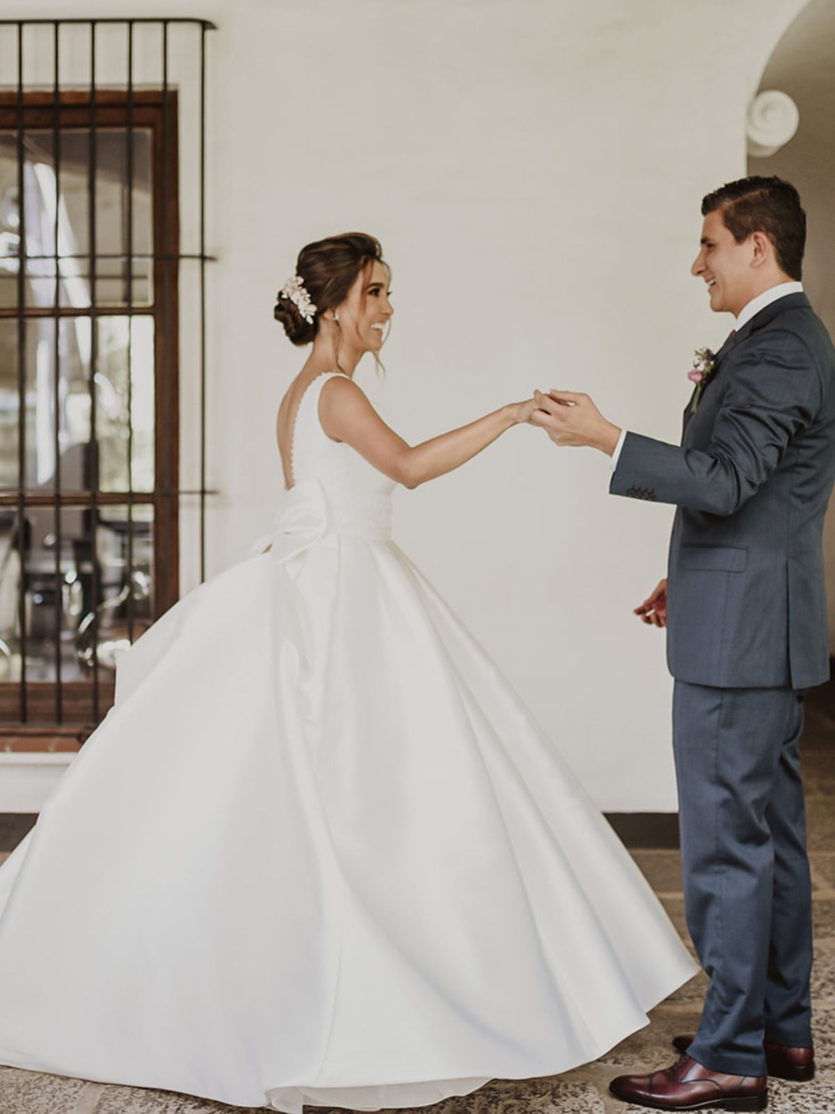 Vestido confeccionado en satinado color ivory, con una caída estructurada y volumen equilibrado. Presenta un escote en V profundo al frente con pequeños bordados alrededor, precioso detalle con pedrería fina en cintura que estiliza el torso sin perder elegancia, que aporta brillo sutil y actúa como punto focal del diseño.