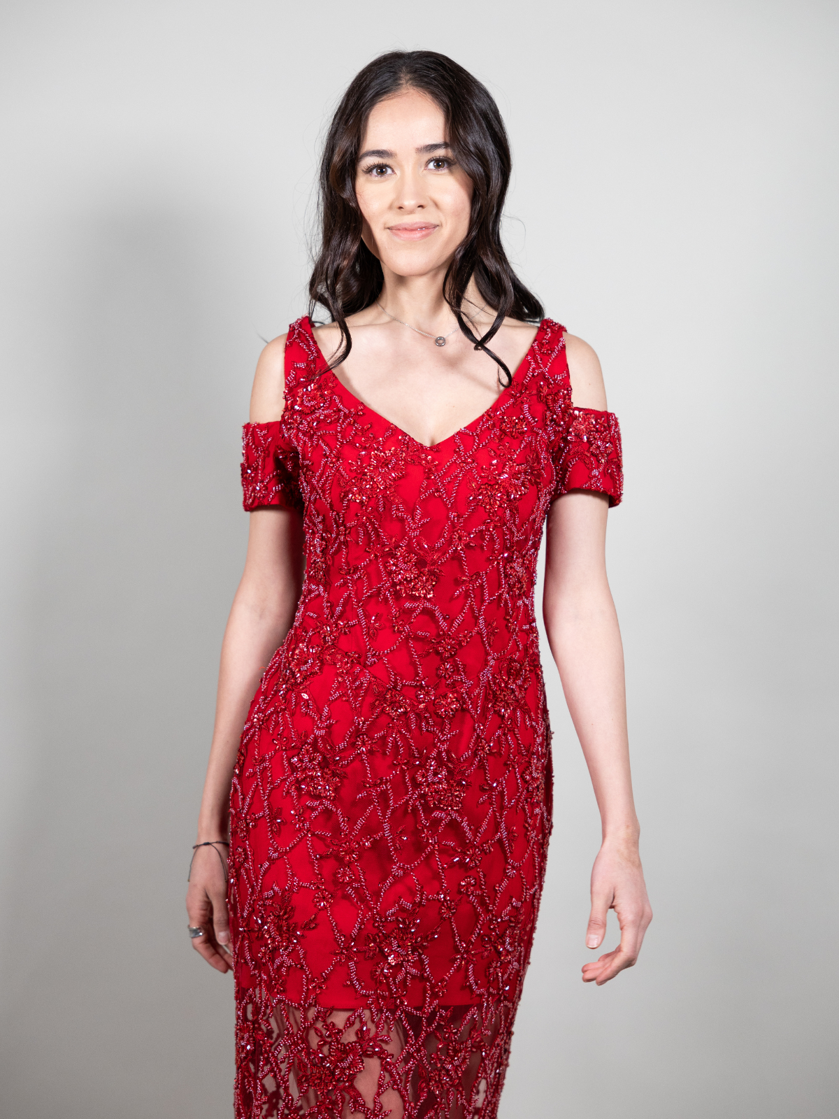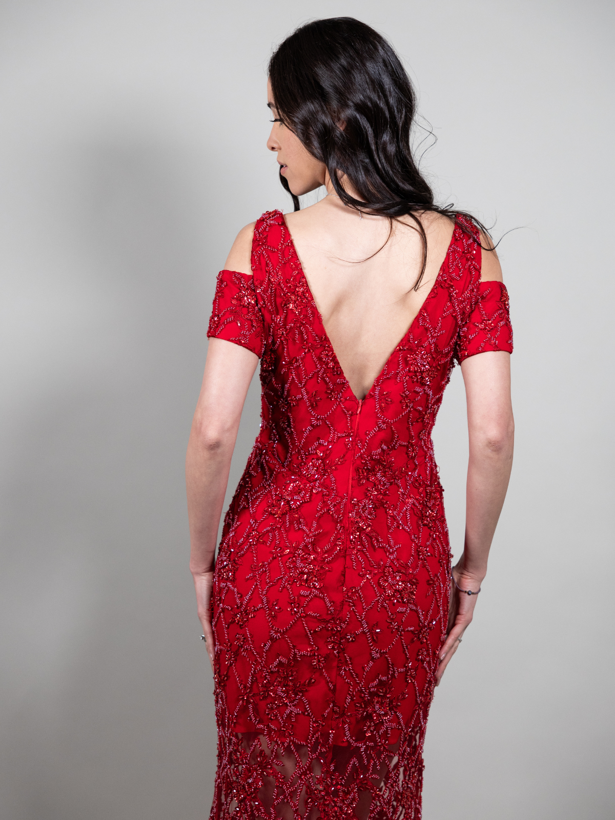 Vestido de noche rojo cereza hecho a la medida por diseñadora Rossy Bela. Tela y bordado importado y de excelente calidad. Se uso solamente una vez en Octubre 2023. Esta en perfectas condiciones y cuenta con su capita para cubrir hombros incluida en el precio del vestido (en su momento se pago por separado).