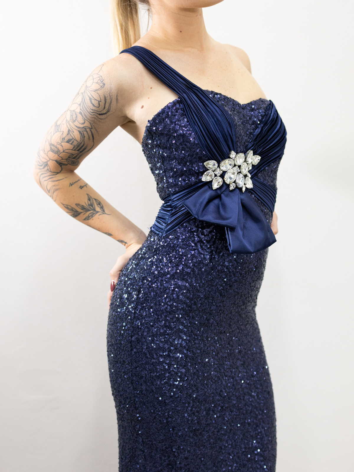 Vestido azul de lentejuelas strappless, con pedrería precioso y en perfecto estado.