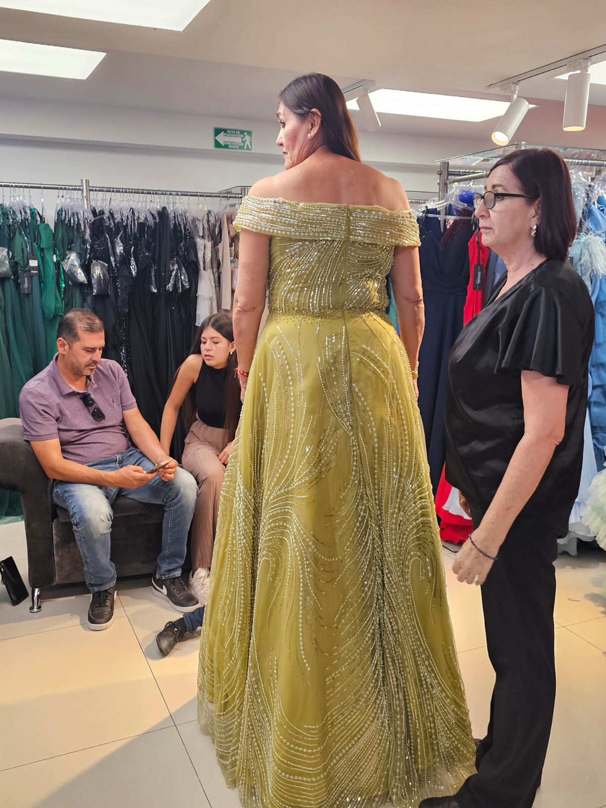Descripción del producto: Elegante vestido Shankara con corte en línea A y escote tipo bardot, ideal para eventos de noche o gala. Confeccionado en tela fluida con aplicaciones de lentejuela y pedrería que forman un diseño en ondas, aportando brillo y movimiento.