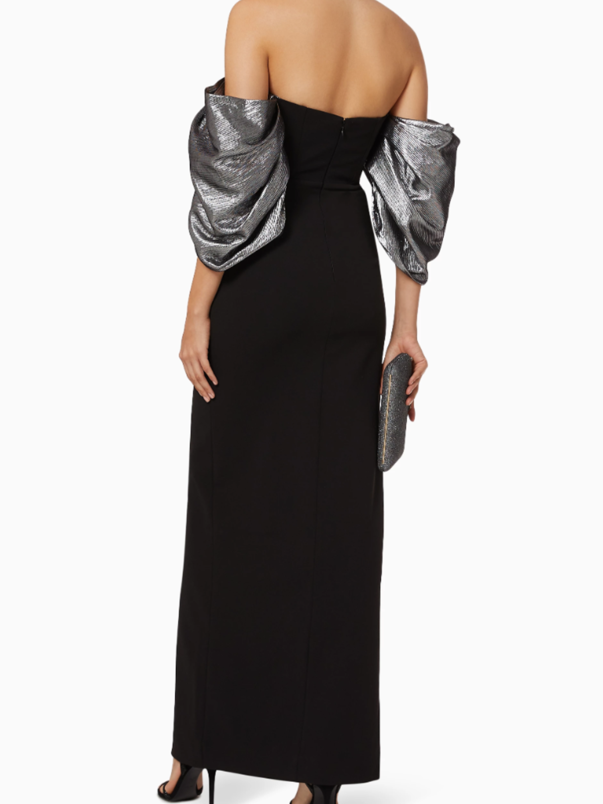 Hermoso vestido negro con mangas plateadas marca Solace London. Altura al tobillo.