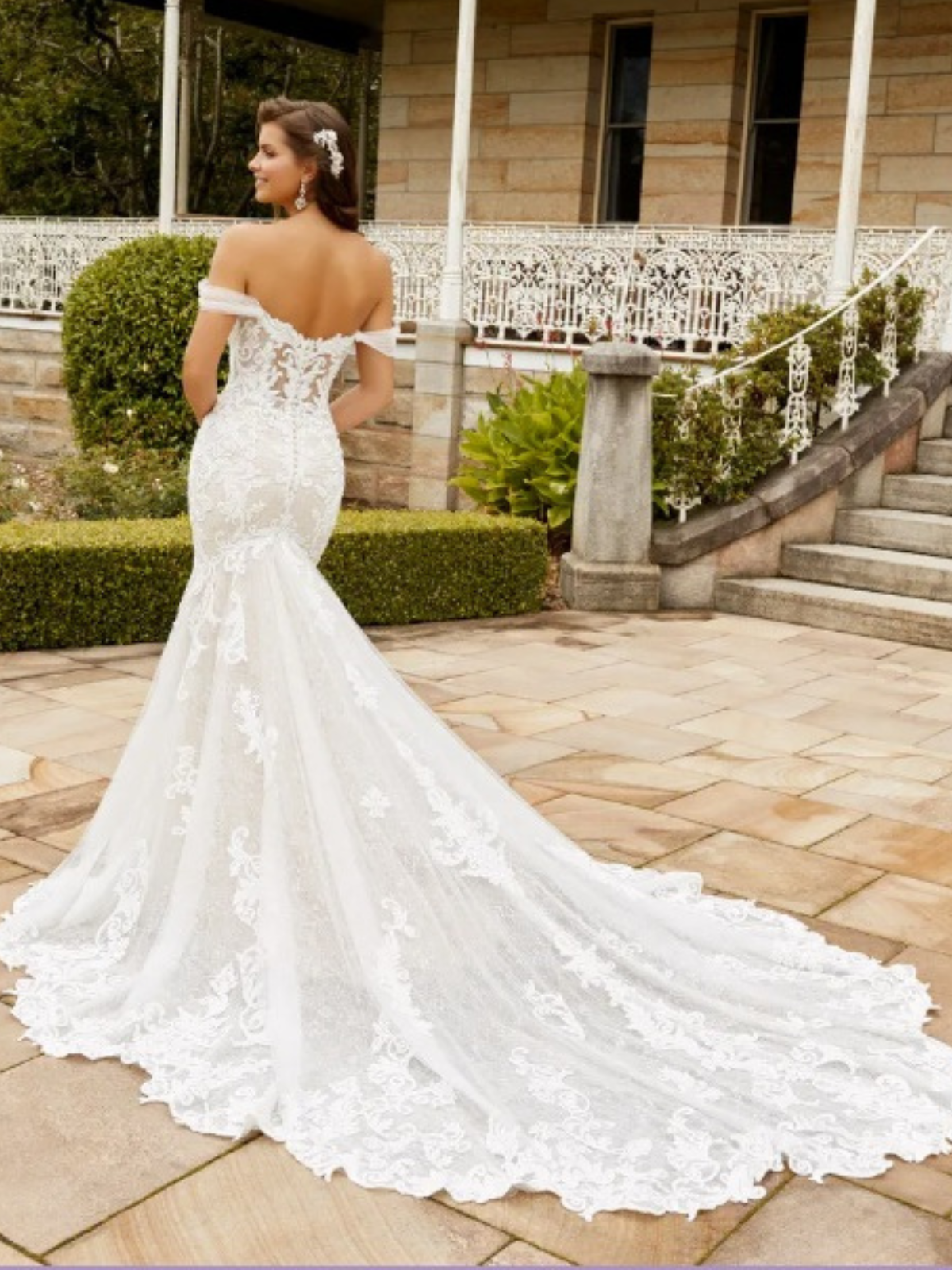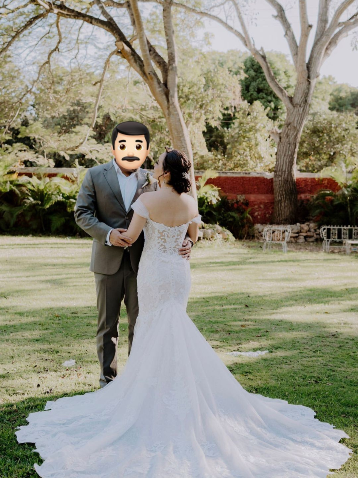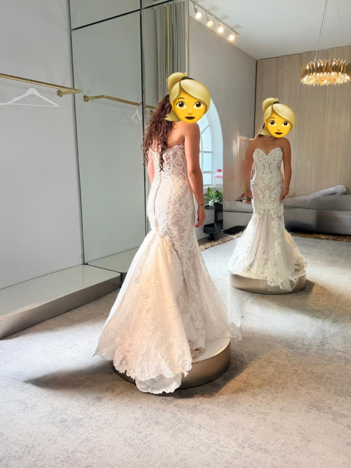Vestido de corte ajustado de sirena, de encaje y con vuelo. El corset es estructurado con transparencias, tirantes caídos sobre los hombros (que se pueden quitar) y un escote corazón. El vestido es muy cómodo para usar todo el día/noche. Aplicaciones de encaje cubierto de lentejuelas que da un brillo elegante. La falda se abre con vuelo desde debajo de la caderas para lograr un ajuste sumamente favorecedor, extendiéndose en una cola semitransparente la cual se puede subir. Excelentes condiciones.
