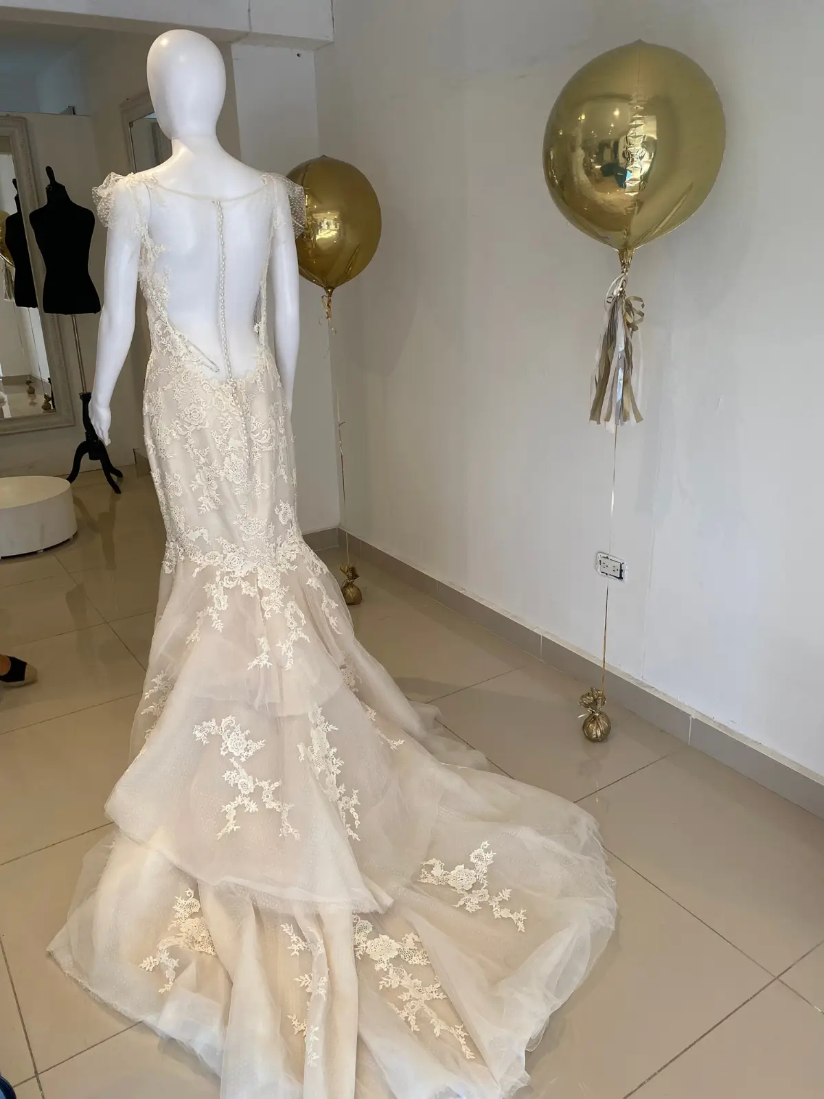 Corte tipo sirena con una hermosa cola, espalda descubierta con detalles lindos de botones, tela tipo poliéster con el encaje hermoso