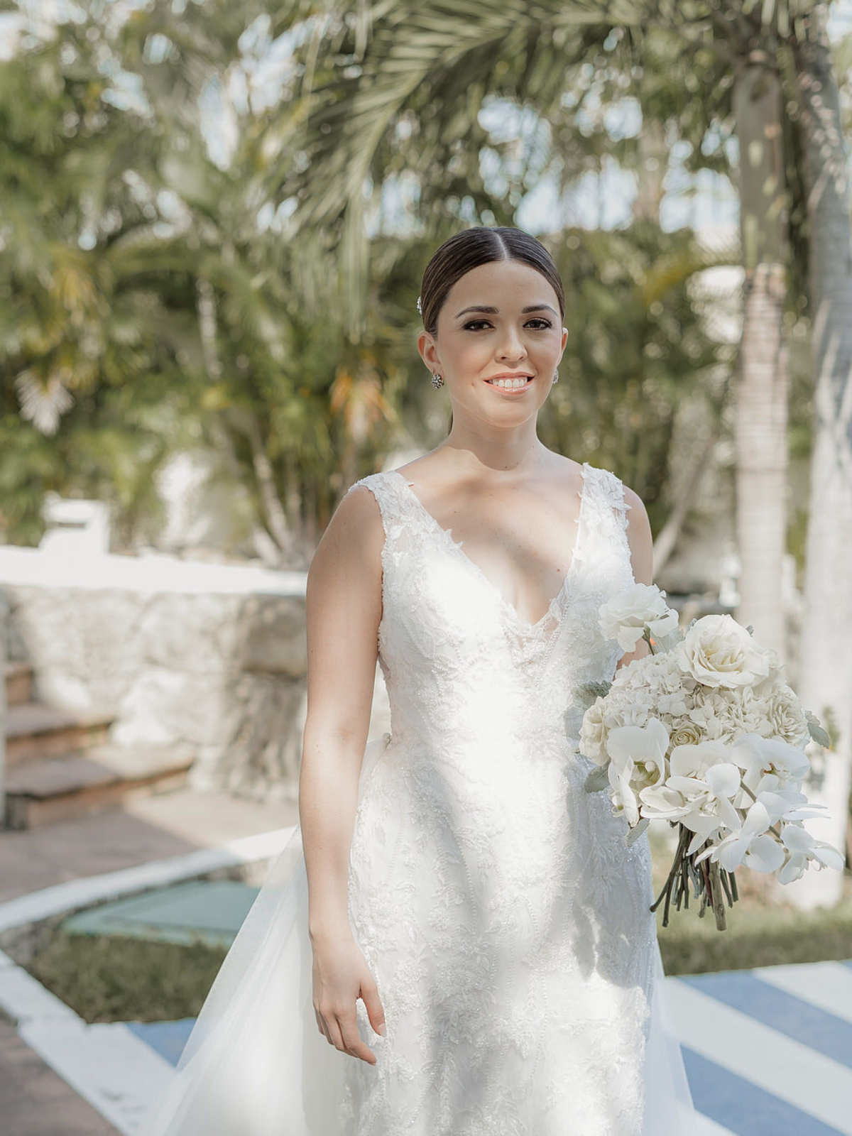 Vestido con cauda que se puede quitar o poner y velo de 3 metros.