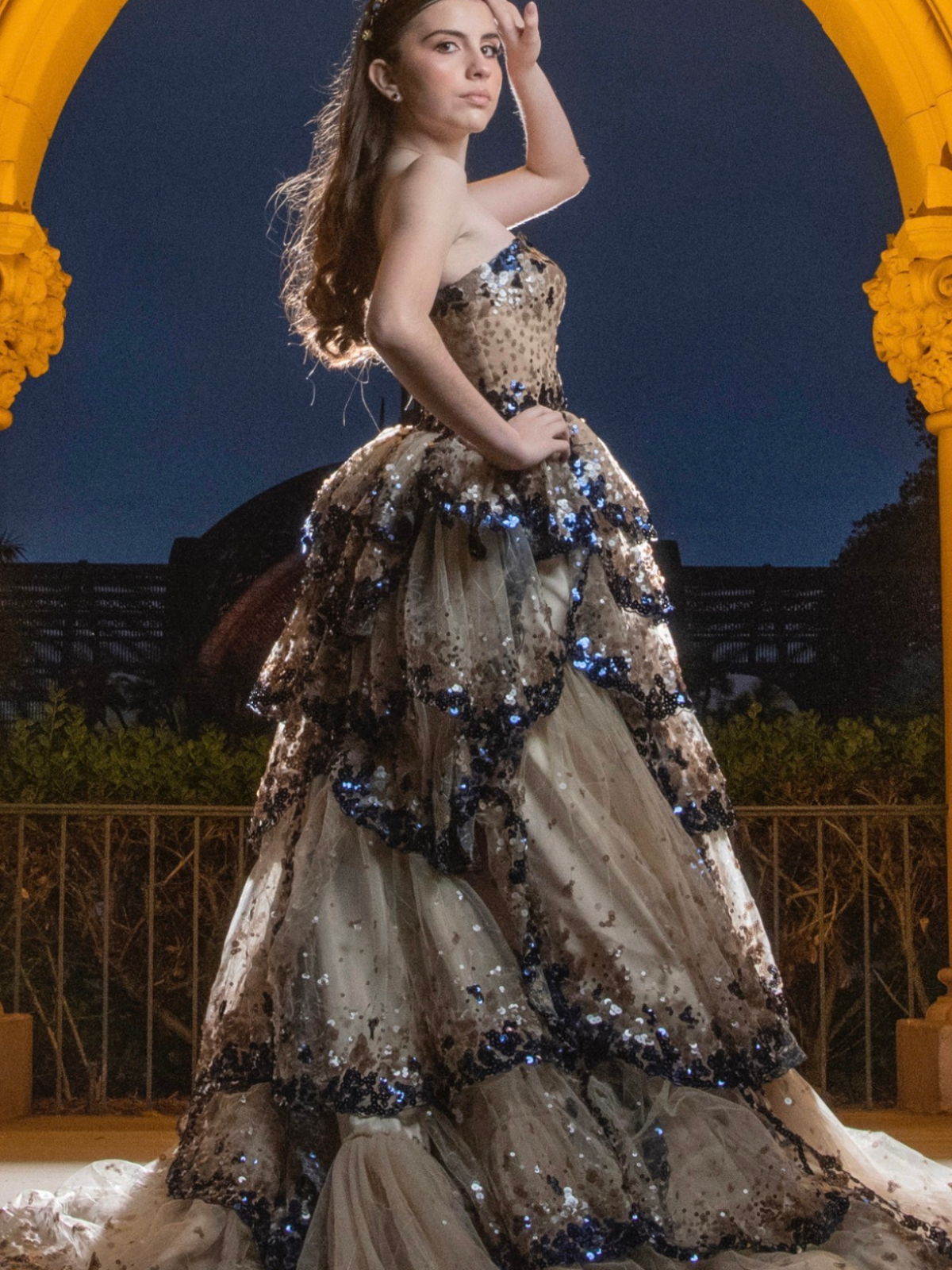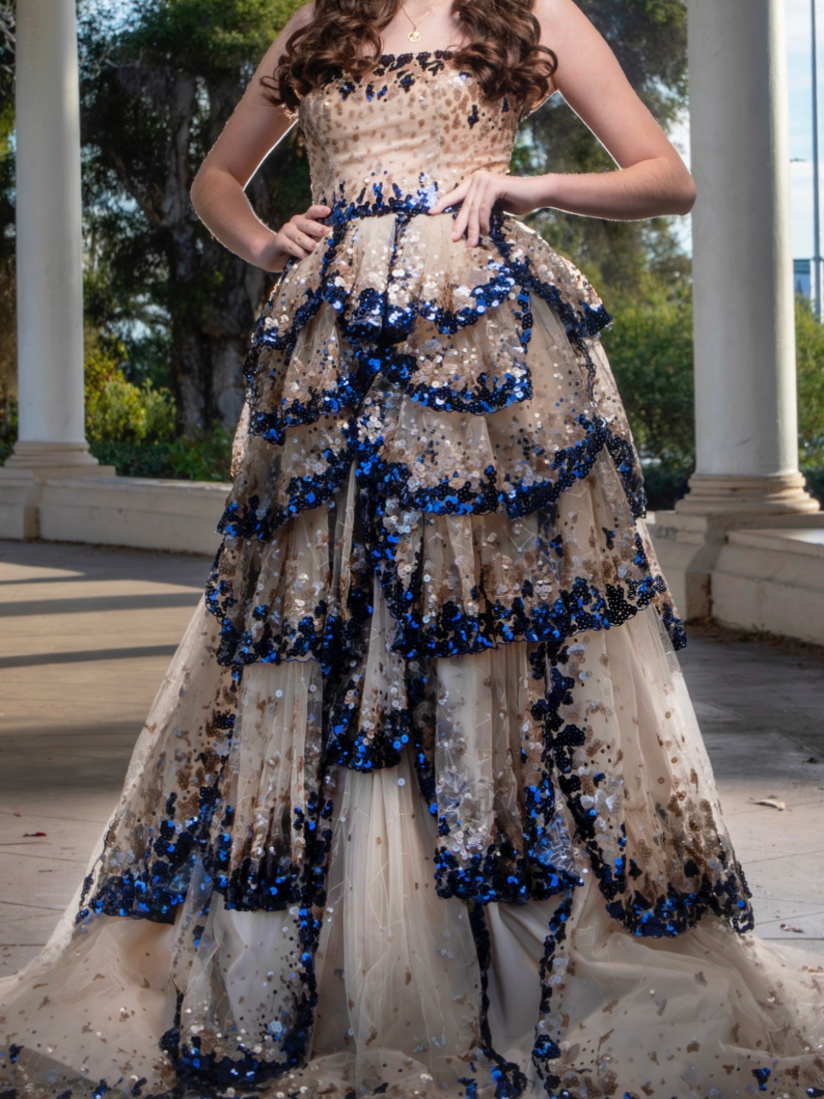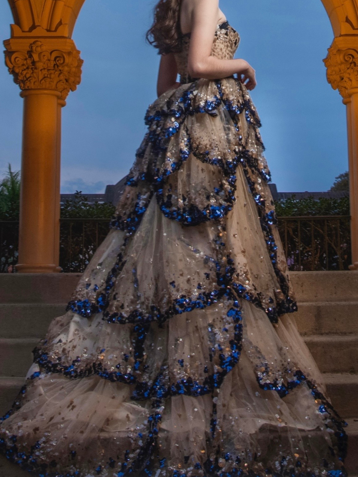 Vestido en corte princesa, con escote strapless, la falda es el punto focal, diseñada con múltiples capas o volantes estilo pétalo que añaden volumen, cuenta con una sutil cauda, tela malla con lentejuelas, el color es Navy/stone