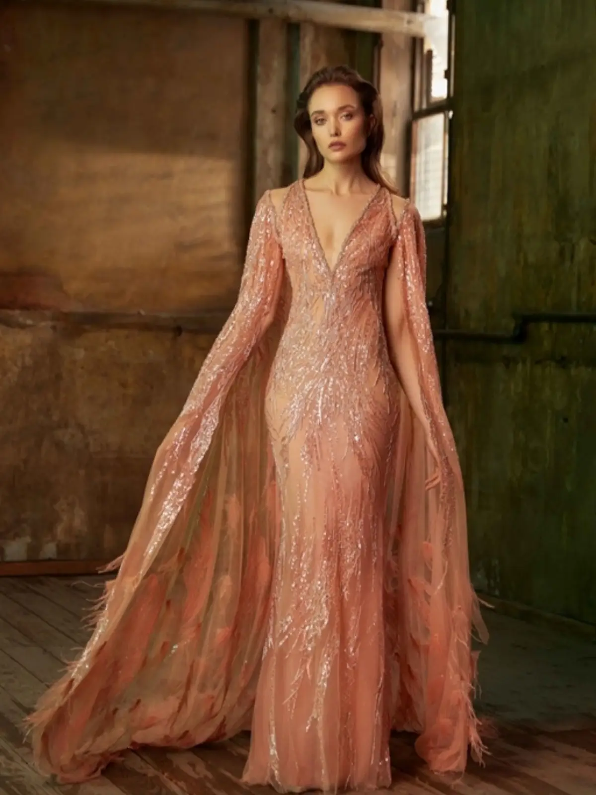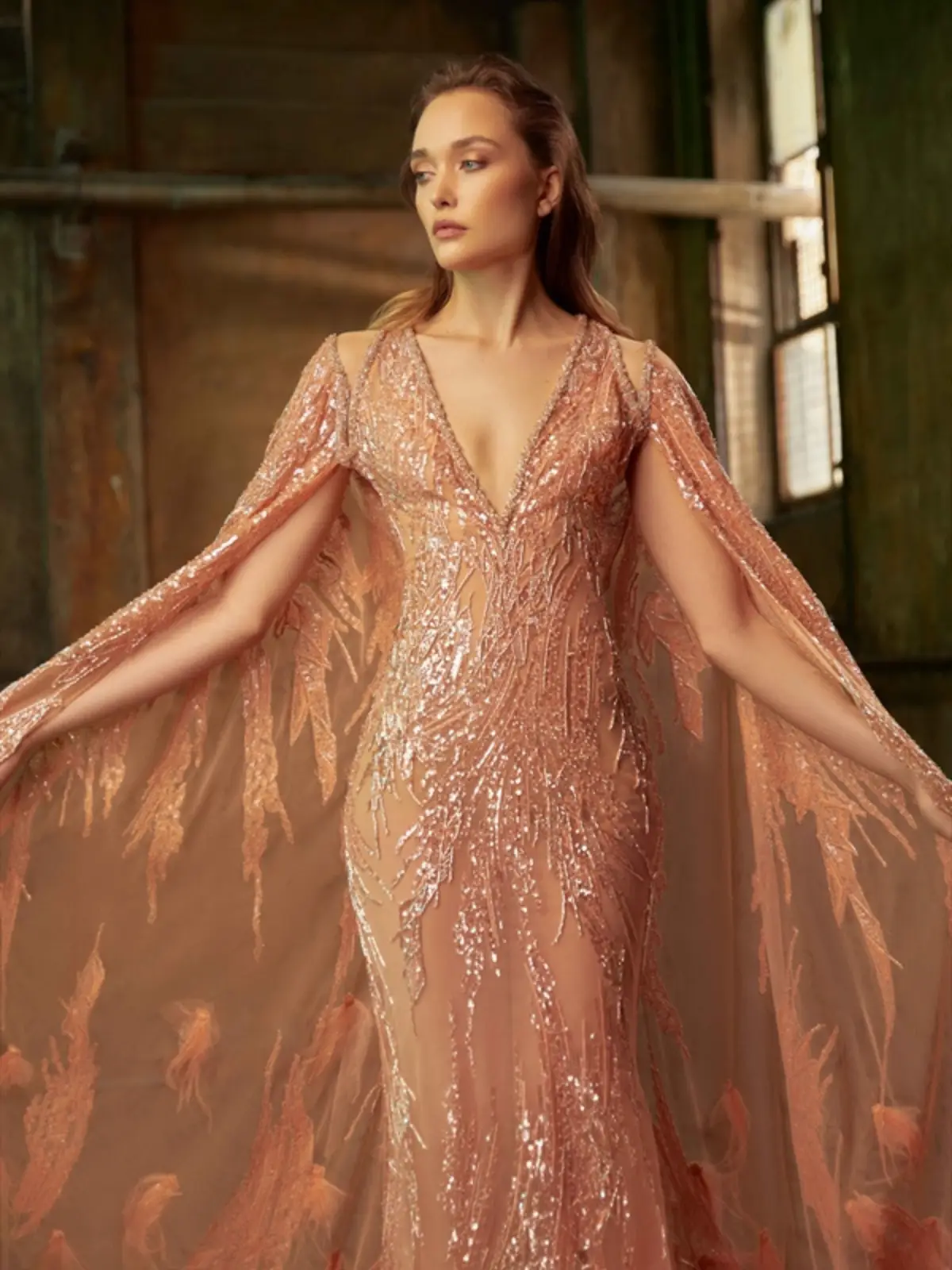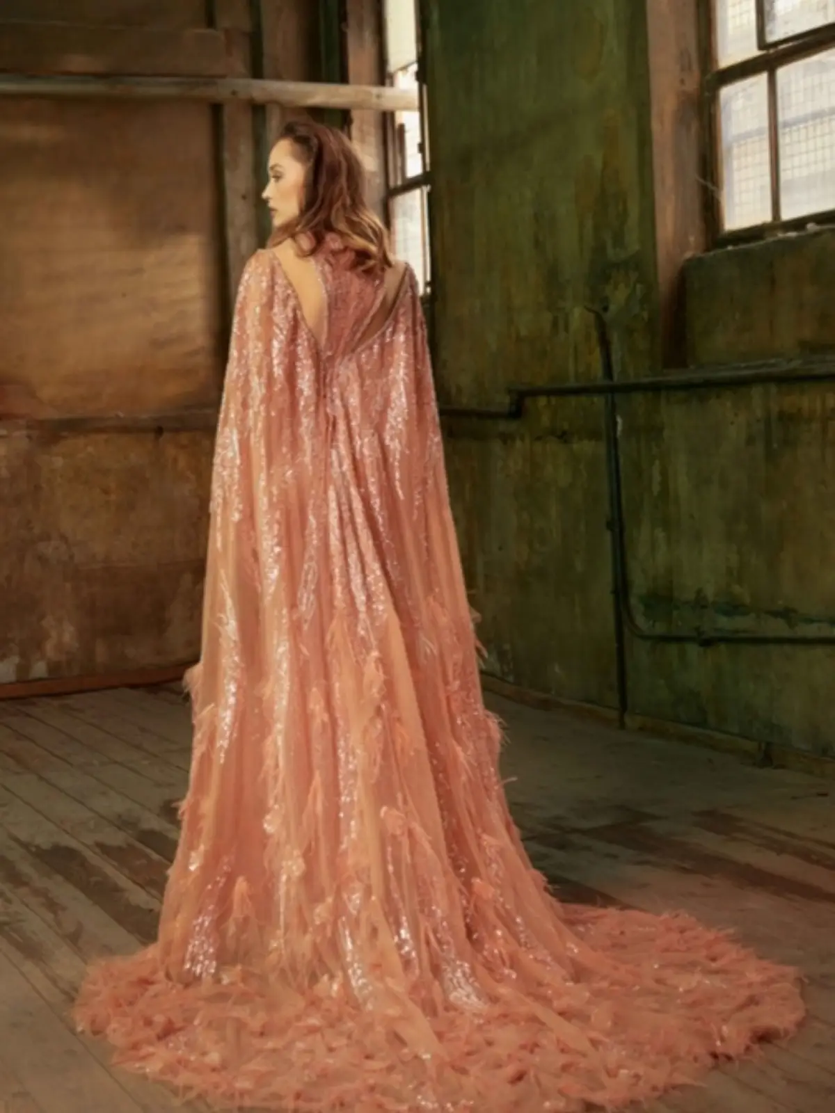Escote en V Vestido con detalle de plumas Vestido con capa Detalle recortado Importado Color: peach