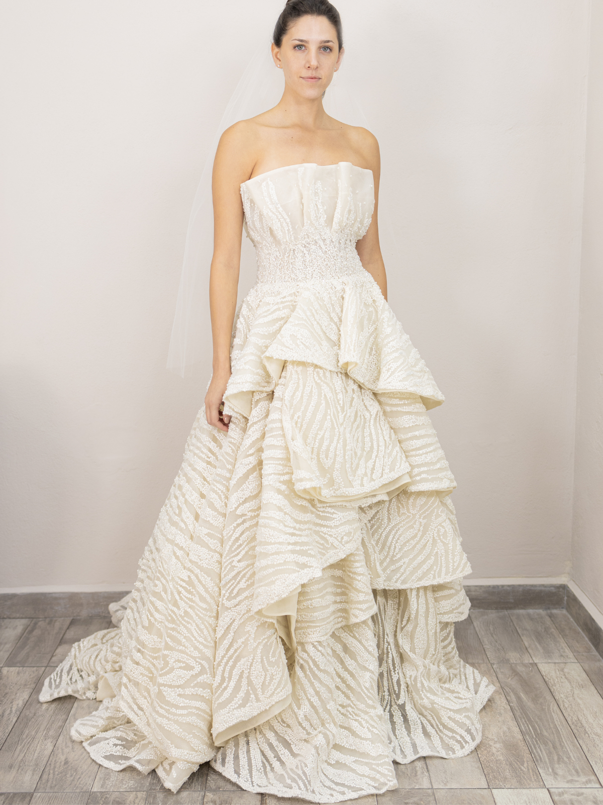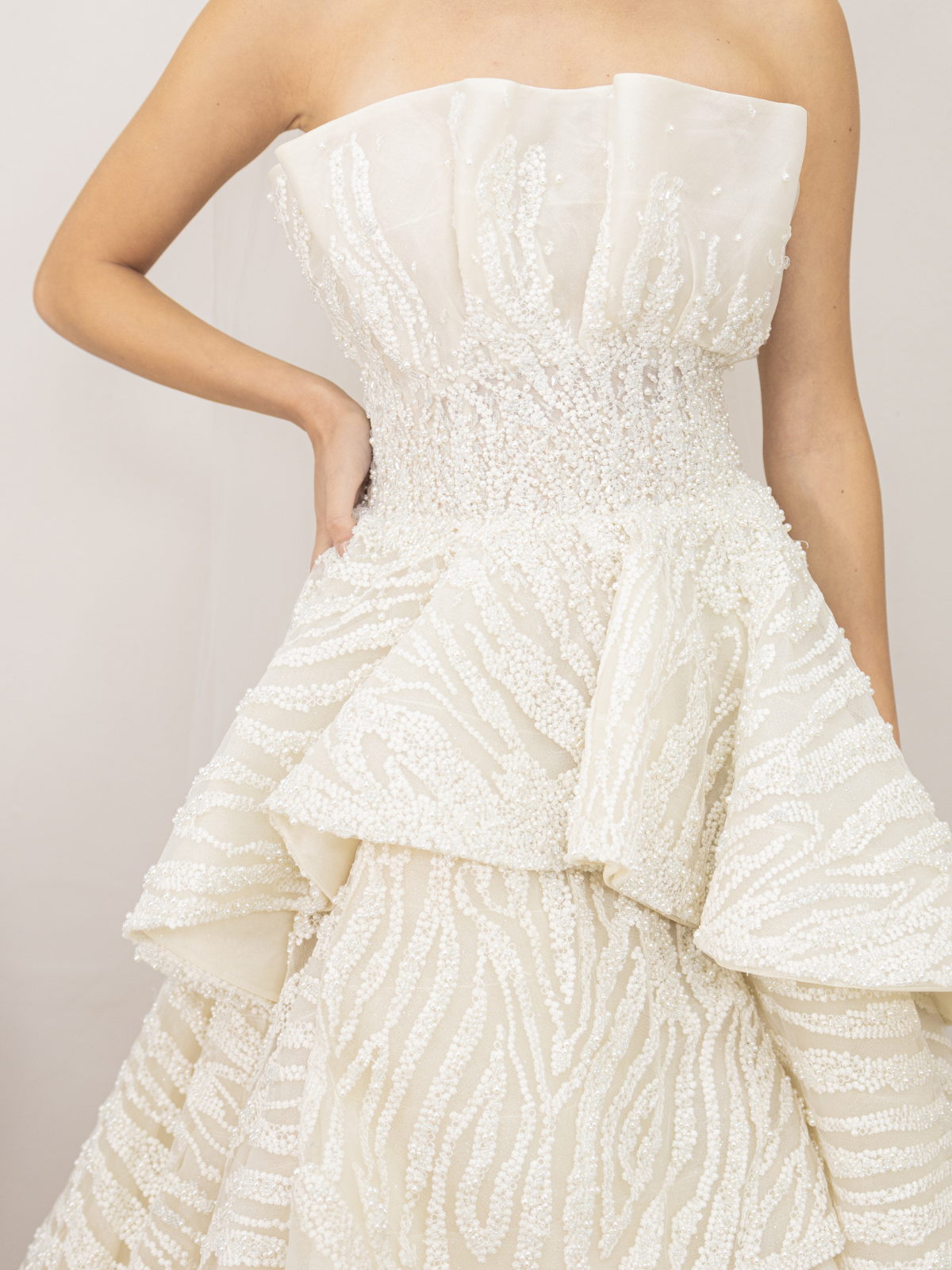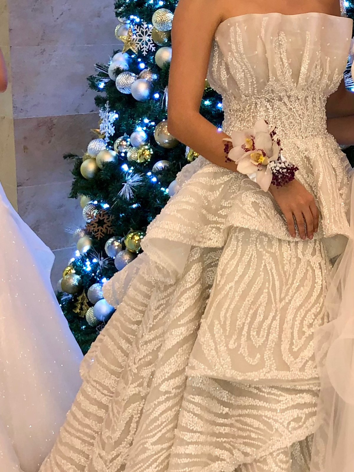 Hermoso vestido de la diseñadora Vero Díaz de solo un uso y la tela es de pura perla con aplicaciones de perlas y cristales bordadas a mano en la cintura.