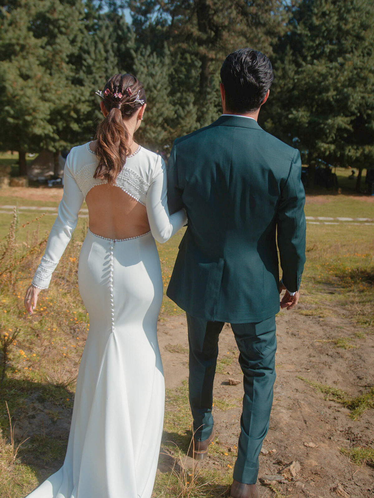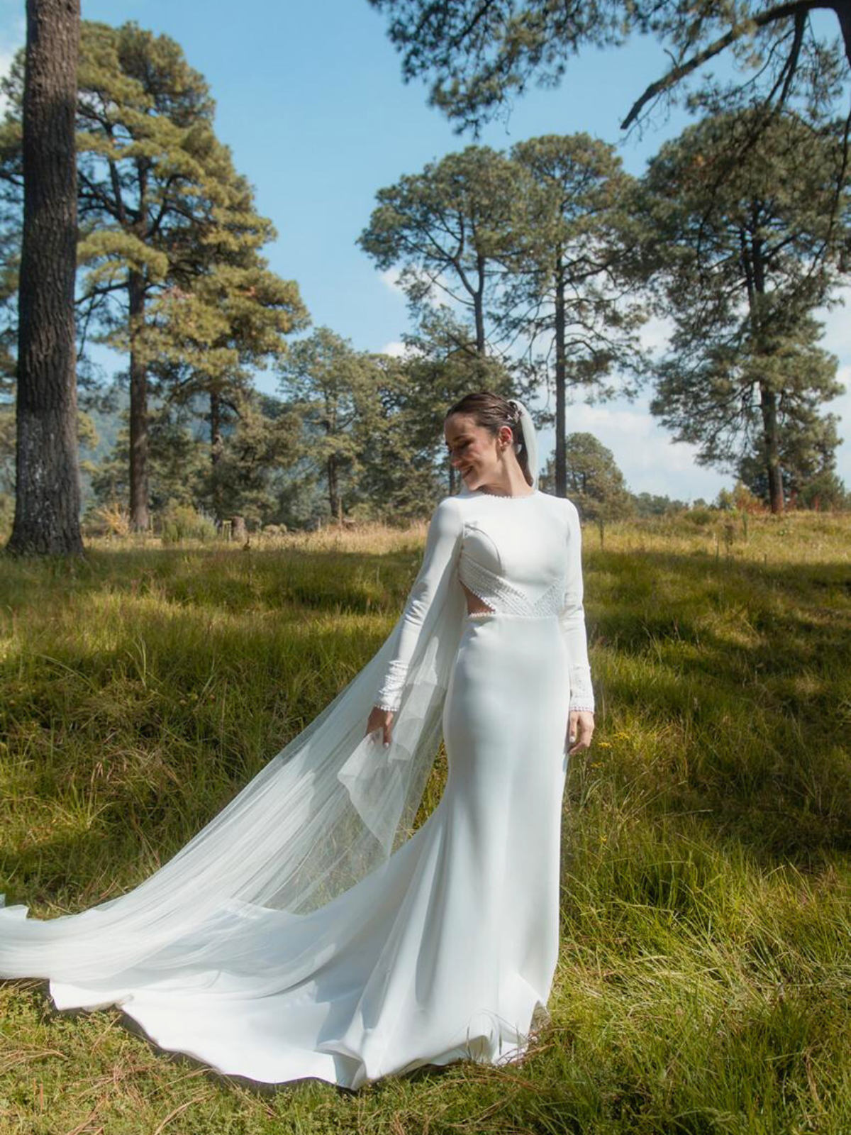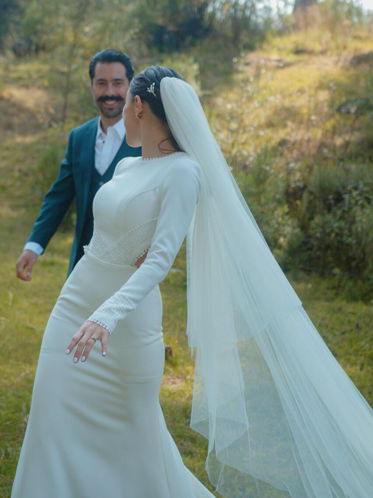 Hecho por la diseñadora mexicana tapatía Viviana Urrea. Es un vestido entallado con una tela strech que te deja moverte y bailar. La elegancia de este vestido está en su sencillez con detalles en las muñecas y todo el borde de del escote de espalda.