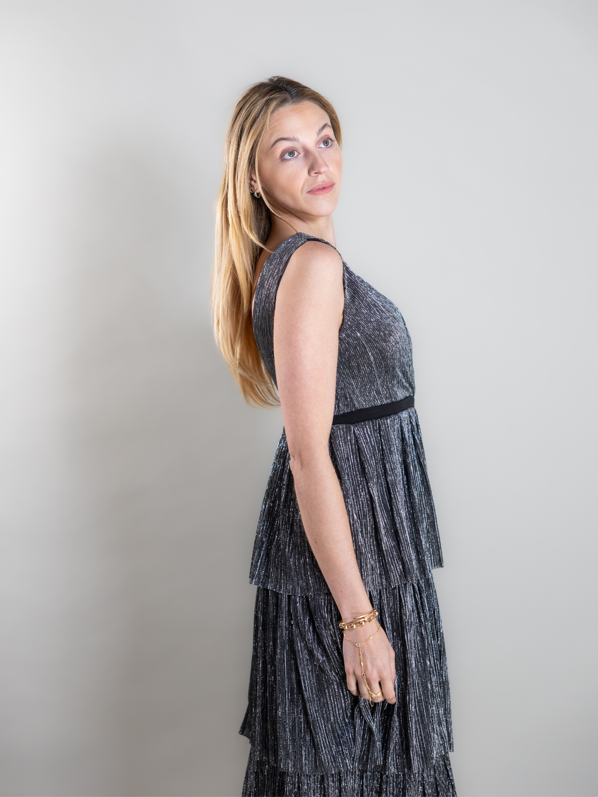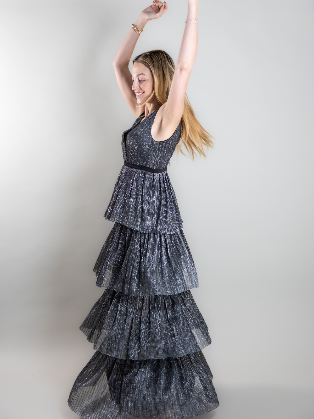 Precioso vestido plateado, con olanes super comodo y elegante.